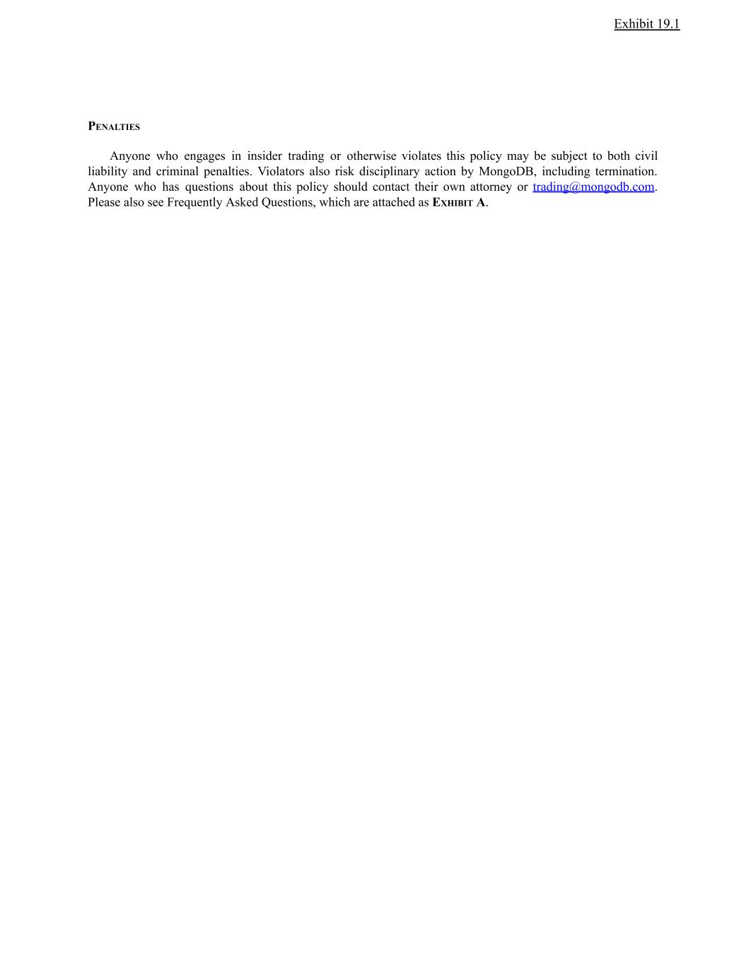 Exhibit 19.1 PENALTIES Anyone who engages in insider trading or otherwise violates this policy may be subject to both civil liability and criminal penalties. Violators also risk disciplinary action by MongoDB, including termination. Anyone who has questions about this policy should contact their own attorney or trading@mongodb.com. Please also see Frequently Asked Questions, which are attached as EXHIBIT A.