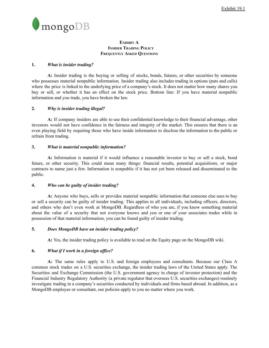 Exhibit 19.1 EXHIBIT A INSIDER TRADING POLICY FREQUENTLY ASKED QUESTIONS 1. What is insider trading? A: Insider trading is the buying or selling of stocks, bonds, futures, or other securities by someone who possesses material nonpublic information. Insider trading also includes trading in options (puts and calls) where the price is linked to the underlying price of a company’s stock. It does not matter how many shares you buy or sell, or whether it has an effect on the stock price. Bottom line: If you have material nonpublic information and you trade, you have broken the law. 2. Why is insider trading illegal? A: If company insiders are able to use their confidential knowledge to their financial advantage, other investors would not have confidence in the fairness and integrity of the market. This ensures that there is an even playing field by requiring those who have inside information to disclose the information to the public or refrain from trading. 3. What is material nonpublic information? A: Information is material if it would influence a reasonable investor to buy or sell a stock, bond future, or other security. This could mean many things: financial results, potential acquisitions, or major contracts to name just a few. Information is nonpublic if it has not yet been released and disseminated to the public. 4. Who can be guilty of insider trading? A: Anyone who buys, sells or provides material nonpublic information that someone else uses to buy or sell a security can be guilty of insider trading. This applies to all individuals, including officers, directors, and others who don’t even work at MongoDB. Regardless of who you are, if you know something material about the value of a security that not everyone knows and you or one of your associates trades while in possession of that material information, you can be found guilty of insider trading. 5. Does MongoDB have an insider trading policy? A: Yes, the insider trading policy is available to read on the Equity page on the MongoDB wiki. 6. What if I work in a foreign office? A: The same rules apply to U.S. and foreign employees and consultants. Because our Class A common stock trades on a U.S. securities exchange, the insider trading laws of the United States apply. The Securities and Exchange Commission (the U.S. government agency in charge of investor protection) and the Financial Industry Regulatory Authority (a private regulator that oversees U.S. securities exchanges) routinely investigate trading in a company’s securities conducted by individuals and firms based abroad. In addition, as a MongoDB employee or consultant, our policies apply to you no matter where you work.