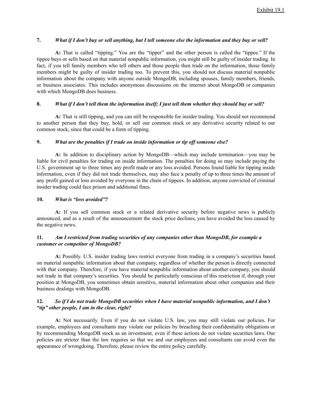 Exhibit 19.1 7. What if I don’t buy or sell anything, but I tell someone else the information and they buy or sell? A: That is called “tipping.” You are the “tipper” and the other person is called the “tippee.” If the tippee buys or sells based on that material nonpublic information, you might still be guilty of insider trading. In fact, if you tell family members who tell others and those people then trade on the information, those family members might be guilty of insider trading too. To prevent this, you should not discuss material nonpublic information about the company with anyone outside MongoDB, including spouses, family members, friends, or business associates. This includes anonymous discussions on the internet about MongoDB or companies with which MongoDB does business. 8. What if I don’t tell them the information itself; I just tell them whether they should buy or sell? A: That is still tipping, and you can still be responsible for insider trading. You should not recommend to another person that they buy, hold, or sell our common stock or any derivative security related to our common stock, since that could be a form of tipping. 9. What are the penalties if I trade on inside information or tip off someone else? A: In addition to disciplinary action by MongoDB—which may include termination—you may be liable for civil penalties for trading on inside information. The penalties for doing so may include paying the U.S. government up to three times any profit made or any loss avoided. Persons found liable for tipping inside information, even if they did not trade themselves, may also face a penalty of up to three times the amount of any profit gained or loss avoided by everyone in the chain of tippees. In addition, anyone convicted of criminal insider trading could face prison and additional fines. 10. What is “loss avoided”? A: If you sell common stock or a related derivative security before negative news is publicly announced, and as a result of the announcement the stock price declines, you have avoided the loss caused by the negative news. 11. Am I restricted from trading securities of any companies other than MongoDB, for example a customer or competitor of MongoDB? A: Possibly. U.S. insider trading laws restrict everyone from trading in a company’s securities based on material nonpublic information about that company, regardless of whether the person is directly connected with that company. Therefore, if you have material nonpublic information about another company, you should not trade in that company’s securities. You should be particularly conscious of this restriction if, through your position at MongoDB, you sometimes obtain sensitive, material information about other companies and their business dealings with MongoDB. 12. So if I do not trade MongoDB securities when I have material nonpublic information, and I don’t “tip” other people, I am in the clear, right? A: Not necessarily. Even if you do not violate U.S. law, you may still violate our policies. For example, employees and consultants may violate our policies by breaching their confidentiality obligations or by recommending MongoDB stock as an investment, even if these actions do not violate securities laws. Our policies are stricter than the law requires so that we and our employees and consultants can avoid even the appearance of wrongdoing. Therefore, please review the entire policy carefully.