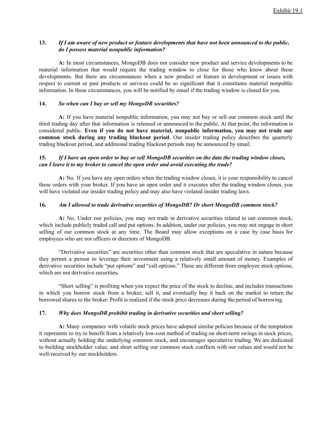 Exhibit 19.1 13. If I am aware of new product or feature developments that have not been announced to the public, do I possess material nonpublic information? A: In most circumstances, MongoDB does not consider new product and service developments to be material information that would require the trading window to close for those who know about these developments. But there are circumstances when a new product or feature in development or issues with respect to current or past products or services could be so significant that it constitutes material nonpublic information. In these circumstances, you will be notified by email if the trading window is closed for you. 14. So when can I buy or sell my MongoDB securities? A: If you have material nonpublic information, you may not buy or sell our common stock until the third trading day after that information is released or announced to the public. At that point, the information is considered public. Even if you do not have material, nonpublic information, you may not trade our common stock during any trading blackout period. Our insider trading policy describes the quarterly trading blackout period, and additional trading blackout periods may be announced by email. 15. If I have an open order to buy or sell MongoDB securities on the date the trading window closes, can I leave it to my broker to cancel the open order and avoid executing the trade? A: No. If you have any open orders when the trading window closes, it is your responsibility to cancel these orders with your broker. If you have an open order and it executes after the trading window closes, you will have violated our insider trading policy and may also have violated insider trading laws. 16. Am I allowed to trade derivative securities of MongoDB? Or short MongoDB common stock? A: No. Under our policies, you may not trade in derivative securities related to our common stock, which include publicly traded call and put options. In addition, under our policies, you may not engage in short selling of our common stock at any time. The Board may allow exceptions on a case by case basis for employees who are not officers or directors of MongoDB. “Derivative securities” are securities other than common stock that are speculative in nature because they permit a person to leverage their investment using a relatively small amount of money. Examples of derivative securities include “put options” and “call options.” These are different from employee stock options, which are not derivative securities. “Short selling” is profiting when you expect the price of the stock to decline, and includes transactions in which you borrow stock from a broker, sell it, and eventually buy it back on the market to return the borrowed shares to the broker. Profit is realized if the stock price decreases during the period of borrowing. 17. Why does MongoDB prohibit trading in derivative securities and short selling? A: Many companies with volatile stock prices have adopted similar policies because of the temptation it represents to try to benefit from a relatively low-cost method of trading on short-term swings in stock prices, without actually holding the underlying common stock, and encourages speculative trading. We are dedicated to building stockholder value, and short selling our common stock conflicts with our values and would not be well-received by our stockholders.
