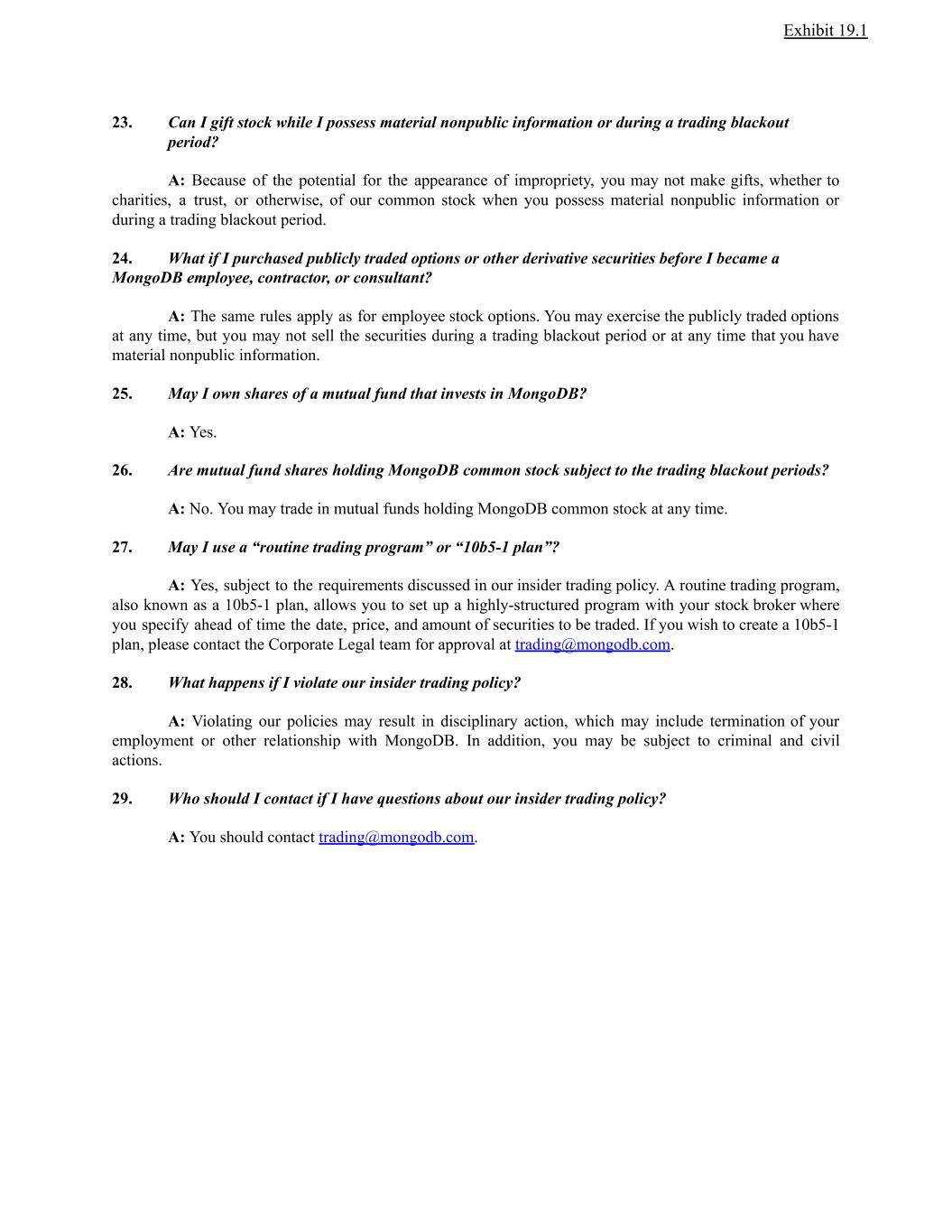Exhibit 19.1 23. Can I gift stock while I possess material nonpublic information or during a trading blackout period? A: Because of the potential for the appearance of impropriety, you may not make gifts, whether to charities, a trust, or otherwise, of our common stock when you possess material nonpublic information or during a trading blackout period. 24. What if I purchased publicly traded options or other derivative securities before I became a MongoDB employee, contractor, or consultant? A: The same rules apply as for employee stock options. You may exercise the publicly traded options at any time, but you may not sell the securities during a trading blackout period or at any time that you have material nonpublic information. 25. May I own shares of a mutual fund that invests in MongoDB? A: Yes. 26. Are mutual fund shares holding MongoDB common stock subject to the trading blackout periods? A: No. You may trade in mutual funds holding MongoDB common stock at any time. 27. May I use a “routine trading program” or “10b5-1 plan”? A: Yes, subject to the requirements discussed in our insider trading policy. A routine trading program, also known as a 10b5-1 plan, allows you to set up a highly-structured program with your stock broker where you specify ahead of time the date, price, and amount of securities to be traded. If you wish to create a 10b5-1 plan, please contact the Corporate Legal team for approval at trading@mongodb.com. 28. What happens if I violate our insider trading policy? A: Violating our policies may result in disciplinary action, which may include termination of your employment or other relationship with MongoDB. In addition, you may be subject to criminal and civil actions. 29. Who should I contact if I have questions about our insider trading policy? A: You should contact trading@mongodb.com.