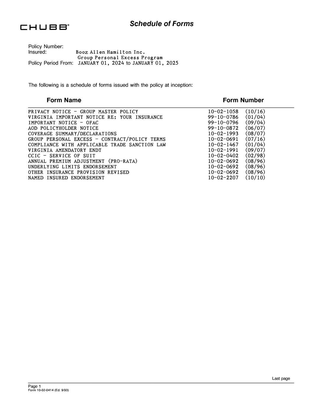 Schedule of Forms Policy Number: Insured: Booz Allen Hamilton Inc. Group Personal Excess Program Policy Period From: JANUARY 01, 2024 to JANUARY 01, 2025 The following is a schedule of forms issued with the policy at inception: Form Name Form Number PRIVACY NOTICE - GROUP MASTER POLICY 10-02-1058 (10/16) VIRGINIA IMPORTANT NOTICE RE: YOUR INSURANCE 99-10-0786 (01/04) IMPORTANT NOTICE - OFAC 99-10-0796 (09/04) AOD POLICYHOLDER NOTICE 99-10-0872 (06/07) COVERAGE SUMMARY/DECLARATIONS 10-02-1993 (08/07) GROUP PERSONAL EXCESS - CONTRACT/POLICY TERMS 10-02-0691 (07/16) COMPLIANCE WITH APPLICABLE TRADE SANCTION LAW 10-02-1467 (01/04) VIRGINIA AMENDATORY ENDT 10-02-1991 (09/07) CCIC - SERVICE OF SUIT 10-02-0402 (02/98) ANNUAL PREMIUM ADJUSTMENT (PRO-RATA) 10-02-0692 (08/96) UNDERLYING LIMITS ENDORSEMENT 10-02-0692 (08/96) OTHER INSURANCE PROVISION REVISED 10-02-0692 (08/96) NAMED INSURED ENDORSEMENT 10-02-2207 (10/10) Last page Page 1 Form 10-02-0414 (Ed. 9/93)
