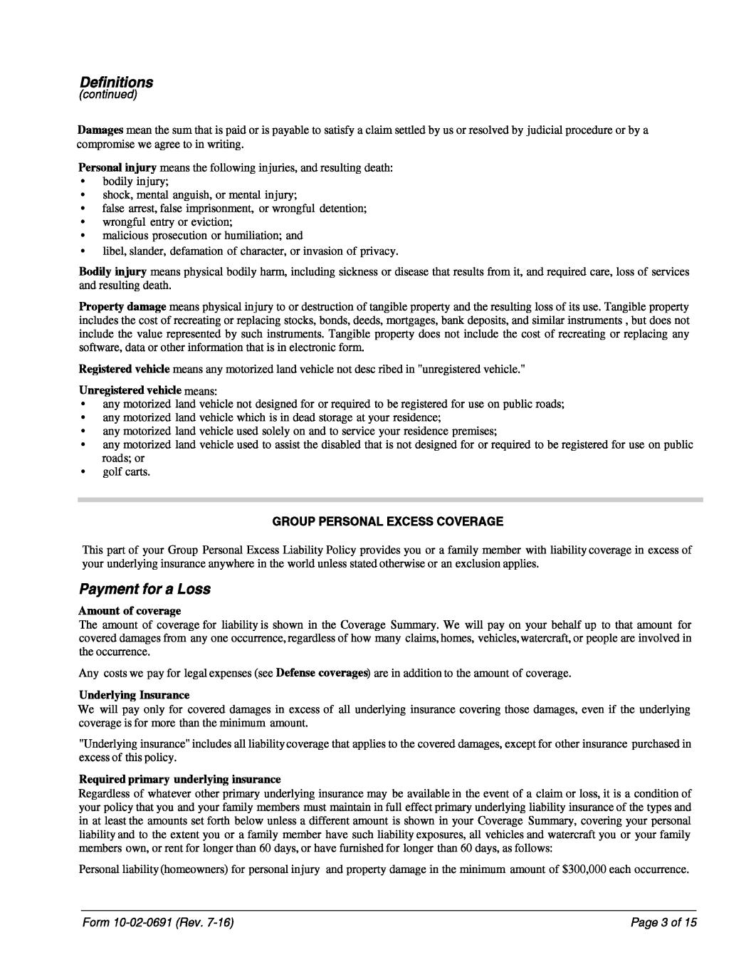 compromise we agree to in writing. injury in or for unless stated liability designed Damages damage defamation or used or is member disabled s tangible We occ injury entry land your minimum instruments. have how in , Amount the cost of underlying damages wrongful or Tangible are or Any will damages from covered bodily harm, including all such to Regardless of only represented humiliation; Liability of of applies for the Payment for a Loss one many registered family member cost of recreating each Personal injury false physical of a Excess stocks, bonds, underlying for (continued) to means means: liability 60 GROUP PERSONAL EXCESS COVERAGE those for Registered vehicle n legal anywhere designed a in insurance that full c verage liability means the following injuries, and resulting death: not exposures, 0 the Required mean the sum that is paid or is payable to satisfy a claim settled by us or resolved by judicial procedure or by a your roads of Insurance any expenses (see days, or have sickness members pay insurance" set forth for family and invasion property be Unregistered vehicle for vehicle all liabilitycoverage to furnished is of The false carts. more ver eviction; below underlying coverage ) covered the amount your re land vehicle than members destruction of property Underlying coverage imprisonment, in unless must maintain your longer primary software, data or other information that is in electronic form. may to addition We for underlying include and that you land vehicle used is the world storage deeds, Definitions coverage Personal personal or the detention; your Summary. homes, and resulting death. means any motorized land vehicle not desc ribed in "unregistered vehicle." liability or includes motorized e and other family solely injury the Coverage bank Personal motorized anguish, or with required care, loss of personal Bodily the mental for includes insurance regardless service coverage. or liability rrence. the for vehicle which amount. and Policy at a yourin at malicious or Group physical to shown different amount damage in excess of of for prosecution or primary injury; required and be "Underlying of (homeowners) and watercraft you the amount and covered motorized recreating or not assist and of provides you or to Property primary extent the by character, excess that privacy. residence • wrongful pay means you Summary, loss, it or replacing any • golf motorized land for • any is or amounts longer replacing dead of • any this policy. or of • shock, injury; than in • any own, insurance in • any ; value t • libel, arrest, • bodily what • policy • costs the your least slander, Form 10-02-0691 (Rev. 7-16) such in on This part we o underlying u mental Defense occurrence, to otherwise that and amount amount of registered if are involved or disease than damages, the watercraft, covering a Page 3 of 15 mortgages, the minimum on your liability coverage purchased in shown in your days, as of be claims, an results from it, is effect a not include applies. behalf even for use types not residence; to exclusion public damages, insurance the excess available premises; except claim instruments but does insurance the vehicles, property covering and similar its up Tangible property does in will event of 6 deposits, follows: other use. is conditionthe vehicles use pay all on Coverage or resulting loss $300,000 that occurrence. required to of insurance or in on public roads; people your family for underlying services