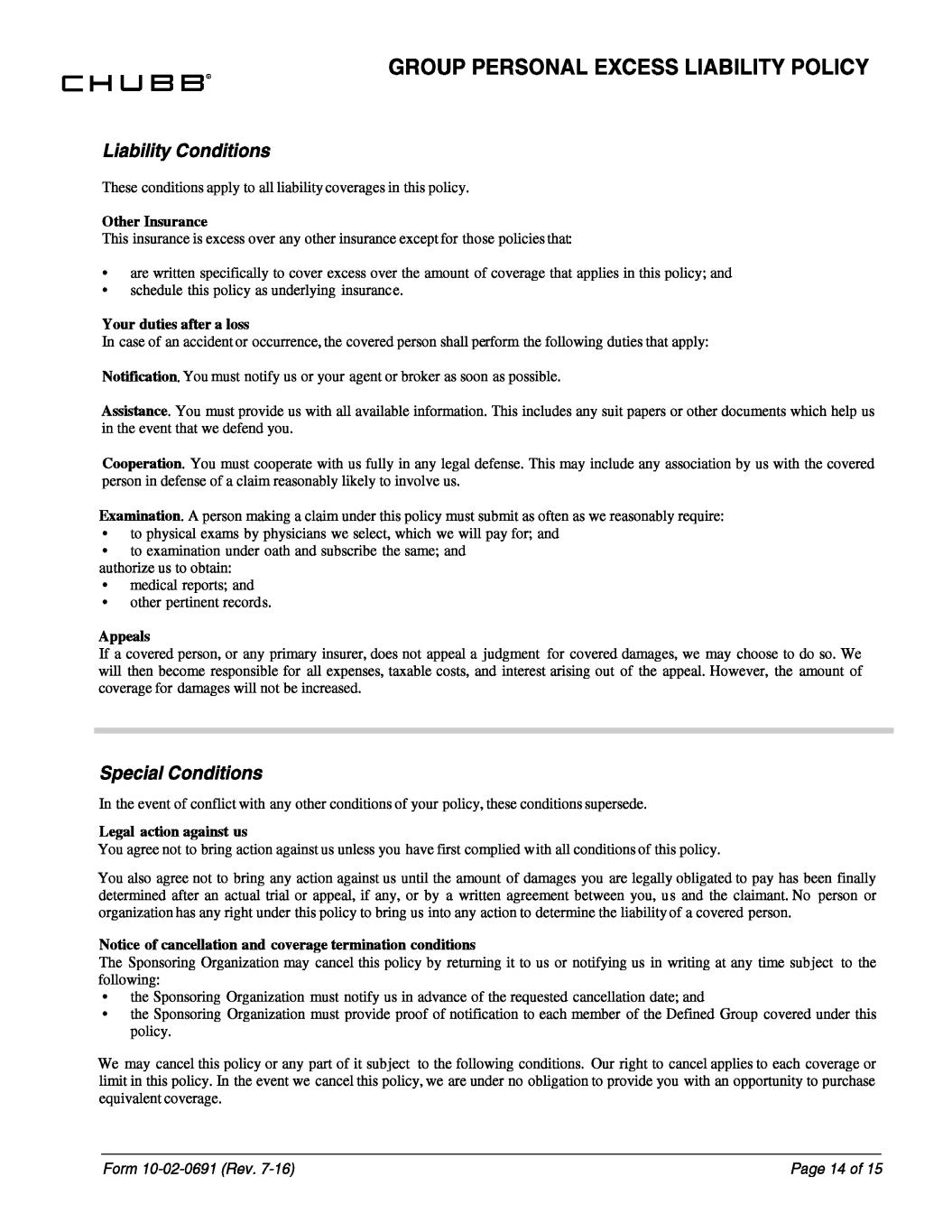 any You may written this must cooperate with us fully in any shall You covered of this responsible any or cancel available information. This We case this after any records any we must insurance until following: e policy. policy occurrence, insurer, does except for will will agree cancellation provide us with all this you broker legal organization to You policy physicians expenses, policy amount u e these determined . You must with trial this your provide of us by c verage Sponsoring actual oath and policy this policy, we and a Appeals Sponsoring right as . to of rform to determine the right limit then for n reports; and under or part of agent the in Examination after a or and any other excess subject conditions the equivalent not . conflict any or for increased. over . this by Legal event has specifically primary subscribe us person first tho Special Conditions coverage conditions which the any appeal. However, each In a also cancel exams to event cover the notify us the appeal authorize agree obtain: bring underlying against or not into amount interest Notice action . A person making a claim under this policy must submit as often as we reasonably require: anyThe Sponsoring bring will all against us unless any, same; policy, pay If the duties damages us over liability coverages in have we Assistanc coverage. under not be other insurance or policy. p action in the event that we defend you. action covered proof of a following conditions. date; These conditions an Organization all termination your as written agreement Notification person, loss may must select, to the soon coverage ach Cooperatio . You must by us appeal, to bring advance of the no In medical against the and policies following duties the polic covered Other Insurance to or defense. obligation include of to association to This policy. accident action Defined an opportunity been finally Your of us to Organization writing applies us with the covered Liability Conditions this person in defense of a claim reasonably likely to involve us. complied includes any suit papers • in examination Organization cancel if taxable costs, the Form 10-02-0691 (Rev. 7-16) we it GROUP PERSONAL EXCESS LIABILITY POLICY • other an not In notify • to physical excess us • the become apply or • schedule is or • the pertinent • are• to of o insurance returning it to ith or : cancellation that cancel and claimant. to are notification conditions supersede. in nder of the tha covered of the u of we ; at by to judgment for t member liability se possible. notifying you, you policy. documents Page 14 of 15 as requested conditions any for; us that between of this to and may Our damages, and may choose has amount of damages applies in this obligated person. No under w e arising to provide This you are us all out legally and Group covered persons with pay the do so. We or other time subject apply: to coverage a y which help to purchase