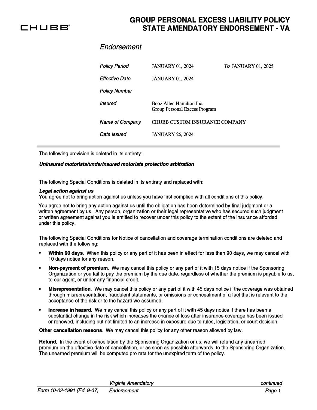 Group Personal Excess Program JANUARY 01, 2025 JANUARY 26, 2024 JANUARY 01, 2024 Booz Allen Hamilton Inc. JANUARY 01, 2024 CHUBB CUSTOM INSURANCE COMPANY Form 10-02-1991 (Ed. 9-07) or written agreement against you is entitled to recover under this policy to the extent of the insurance afforded under this policy. written agreement by us. Any person, organization or their legal representative who has secured such judgment You agree not to bring any action against us until the obligation has been determined by final judgment or a You agree not to bring action against us unless you have first complied with all conditions of this policy. Uninsured motorists/underinsured motorists protection arbitration The following Special Conditions for Notice of cancellation and coverage termination conditions are deleted and replaced with the following: • substantial change in the risk which increases the chance of loss after insurance coverage has been issued • Increase in hazard We may cancel this policy or any part of it with 45 days notice if the coverage was obtained • or renewed, including but not limited to an increase in exposure due to rules, legislation, or court decision. • through misrepresentation, fraudulent statements, or omissions or concealment of a fact that is relevant to the The following Special Conditions is deleted in its entirety and replaced with: To continued The following provision is deleted in its entirety: STATE AMENDATORY ENDORSEMENT - VA Legal action against us We may cancel this policy or any part of it with 45 days notice if there has been a Other cancellation reasons We may cancel this policy for any other reason allowed by law. Page 1 The unearned premium will be computed pro rata for the unexpired term of the policy. Refund In the event of cancellation by the Sponsoring Organization or us, we will refund any unearned premium on the effective date of cancellation, or as soon as possible afterwards, to the Sponsoring Organization. Misrepresentation Organization or you fail to pay the premium by the due date, regardless of whether the premium is payable to us, Non-payment of premium Endorsement to our agent, or under any financial credit. 10 days notice for any reason. GROUP PERSONAL EXCESS LIABILITY POLICY Within 90 days When this policy or any part of it has been in effect for less than 90 days, we may cancel with acceptance of the risk or to the hazard we assumed. . . . Effective Date . Insured Endorsement Policy Period Name of Company Date Issued Policy Number . . We may cancel this policy or any part of it with 15 days notice if the Sponsoring Virginia Amendatory