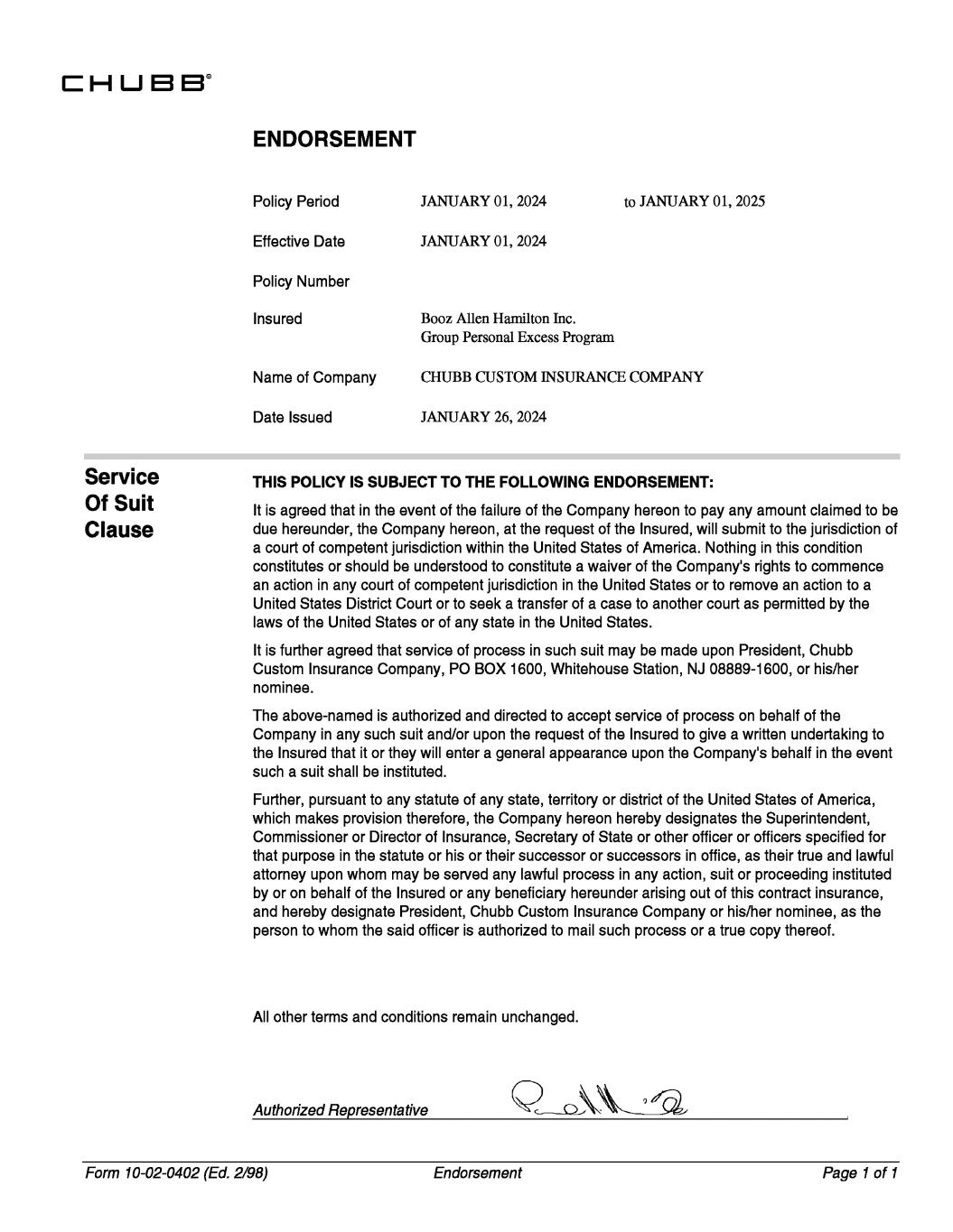 JANUARY 01, 2024 JANUARY 01, 2025 JANUARY 01, 2024 Booz Allen Hamilton Inc. Group Personal Excess Program CHUBB CUSTOM INSURANCE COMPANY JANUARY 26, 2024 UVWX Clause Of Suit Service Form 10-02-0402 (Ed. 2/98) Date Issued a court of competent jurisdiction within the United States of America. Nothing in this condition attorney upon whom may be served any lawful process in any action, suit or proceeding instituted by or on behalf of the Insured or any beneficiary hereunder arising out of this contract insurance, All other terms and conditions remain unchanged. Authorized Representative Endorsement Policy Number such a suit shall be instituted. Name of Company which makes provision therefore, the Company hereon hereby designates the Superintendent, The above-named is authorized and directed to accept service of process on behalf of the THIS POLICY IS SUBJECT TO THE FOLLOWING ENDORSEMENT: nominee. Custom Insurance Company, PO BOX 1600, Whitehouse Station, NJ 08889-1600, or his/her constitutes or should be understood to constitute a waiver of the Company's rights to commence 1 ENDORSEMENT United States District Court or to seek a transfer of a case to another court as permitted by the of Policy Period laws of the United States or of any state in the United States. It is further agreed that service of process in such suit may be made upon President, Chubb due hereunder, the Company hereon, at the request of the Insured, will submit to the jurisdiction of It is agreed that in the event of the failure of the Company hereon to pay any amount claimed to be Company in any such suit and/or upon the request of the Insured to give a written undertaking to Insured to Further, pursuant to any statute of any state, territory or district of the United States of America, Effective Date the Insured that it or they will enter a general appearance upon the Company's behalf in the event person to whom the said officer is authorized to mail such process or a true copy thereof. and hereby designate President, Chubb Custom Insurance Company or his/her nominee, as the that purpose in the statute or his or their successor or successors in office, as their true and lawful Commissioner or Director of Insurance, Secretary of State or other officer or officers specified for an action in any court of competent jurisdiction in the United States or to remove an action to a Page 1