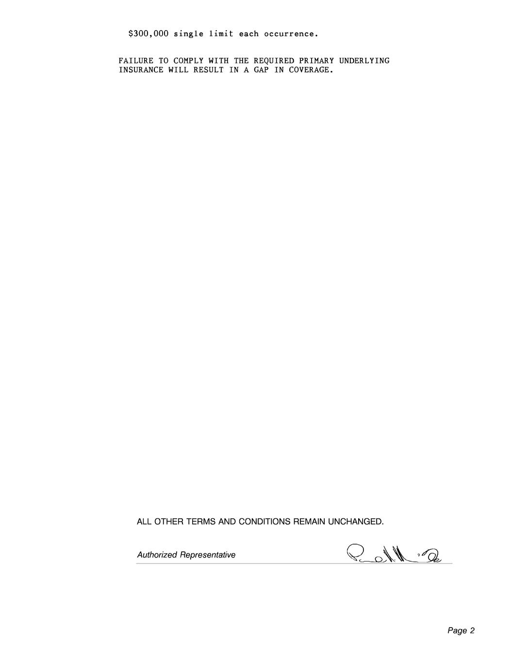$300,000 single limit each occurrence. FAILURE TO COMPLY WITH THE REQUIRED PRIMARY UNDERLYING INSURANCE WILL RESULT IN A GAP IN COVERAGE. ALL OTHER TERMS AND CONDITIONS REMAIN UNCHANGED. Authorized Representative ABCD Page 2