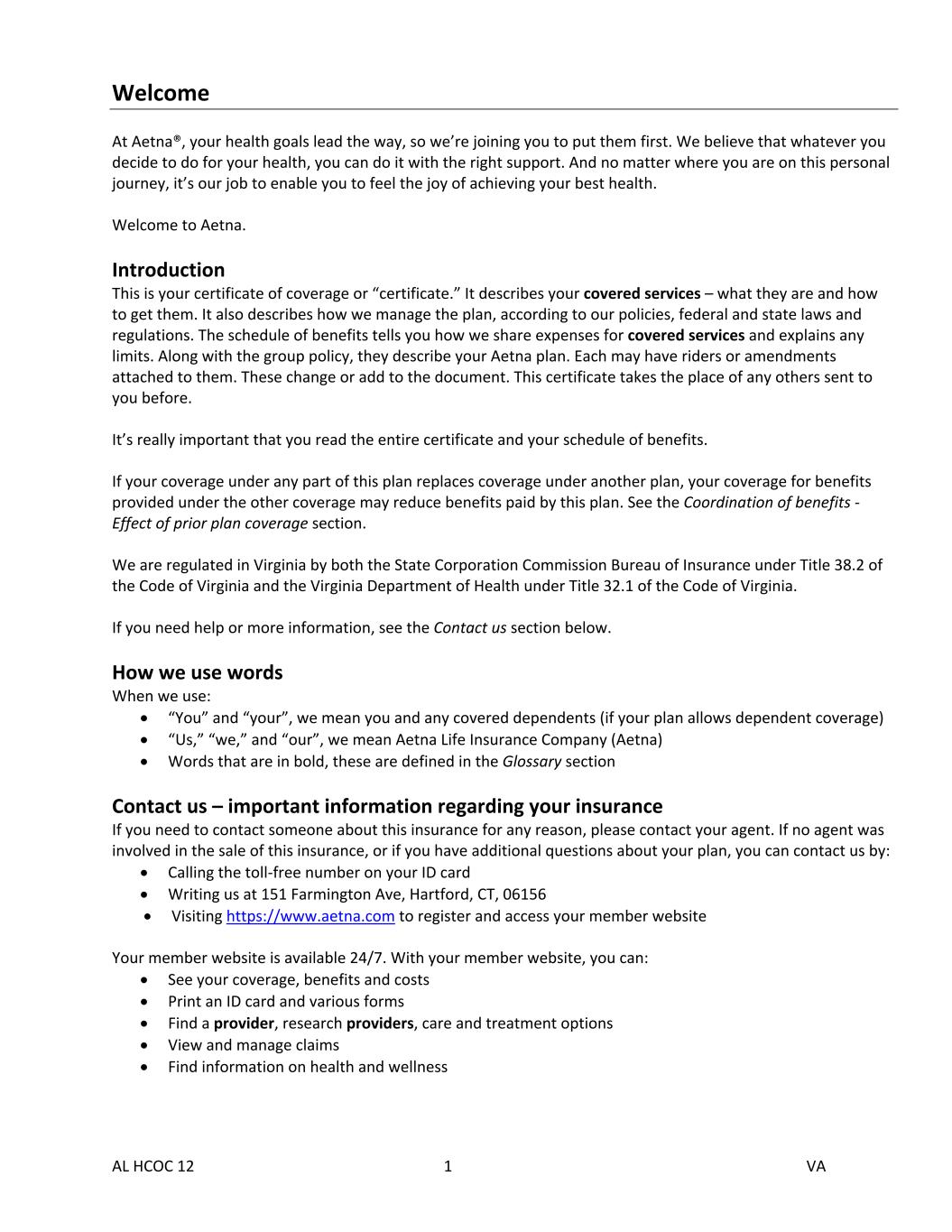 AL HCOC 12 1 VA Welcome At Aetna®, your health goals lead the way, so we’re joining you to put them first. We believe that whatever you decide to do for your health, you can do it with the right support. And no matter where you are on this personal journey, it’s our job to enable you to feel the joy of achieving your best health. Welcome to Aetna. Introduction This is your certificate of coverage or “certificate.” It describes your covered services – what they are and how to get them. It also describes how we manage the plan, according to our policies, federal and state laws and regulations. The schedule of benefits tells you how we share expenses for covered services and explains any limits. Along with the group policy, they describe your Aetna plan. Each may have riders or amendments attached to them. These change or add to the document. This certificate takes the place of any others sent to you before. It’s really important that you read the entire certificate and your schedule of benefits. If your coverage under any part of this plan replaces coverage under another plan, your coverage for benefits provided under the other coverage may reduce benefits paid by this plan. See the Coordination of benefits - Effect of prior plan coverage section. We are regulated in Virginia by both the State Corporation Commission Bureau of Insurance under Title 38.2 of the Code of Virginia and the Virginia Department of Health under Title 32.1 of the Code of Virginia. If you need help or more information, see the Contact us section below. How we use words When we use: “You” and “your”, we mean you and any covered dependents (if your plan allows dependent coverage) “Us,” “we,” and “our”, we mean Aetna Life Insurance Company (Aetna) Words that are in bold, these are defined in the Glossary section Contact us – important information regarding your insurance If you need to contact someone about this insurance for any reason, please contact your agent. If no agent was involved in the sale of this insurance, or if you have additional questions about your plan, you can contact us by: Calling the toll-free number on your ID card Writing us at 151 Farmington Ave, Hartford, CT, 06156 Visiting https://www.aetna.com to register and access your member website Your member website is available 24/7. With your member website, you can: See your coverage, benefits and costs Print an ID card and various forms Find a provider, research providers, care and treatment options View and manage claims Find information on health and wellness
