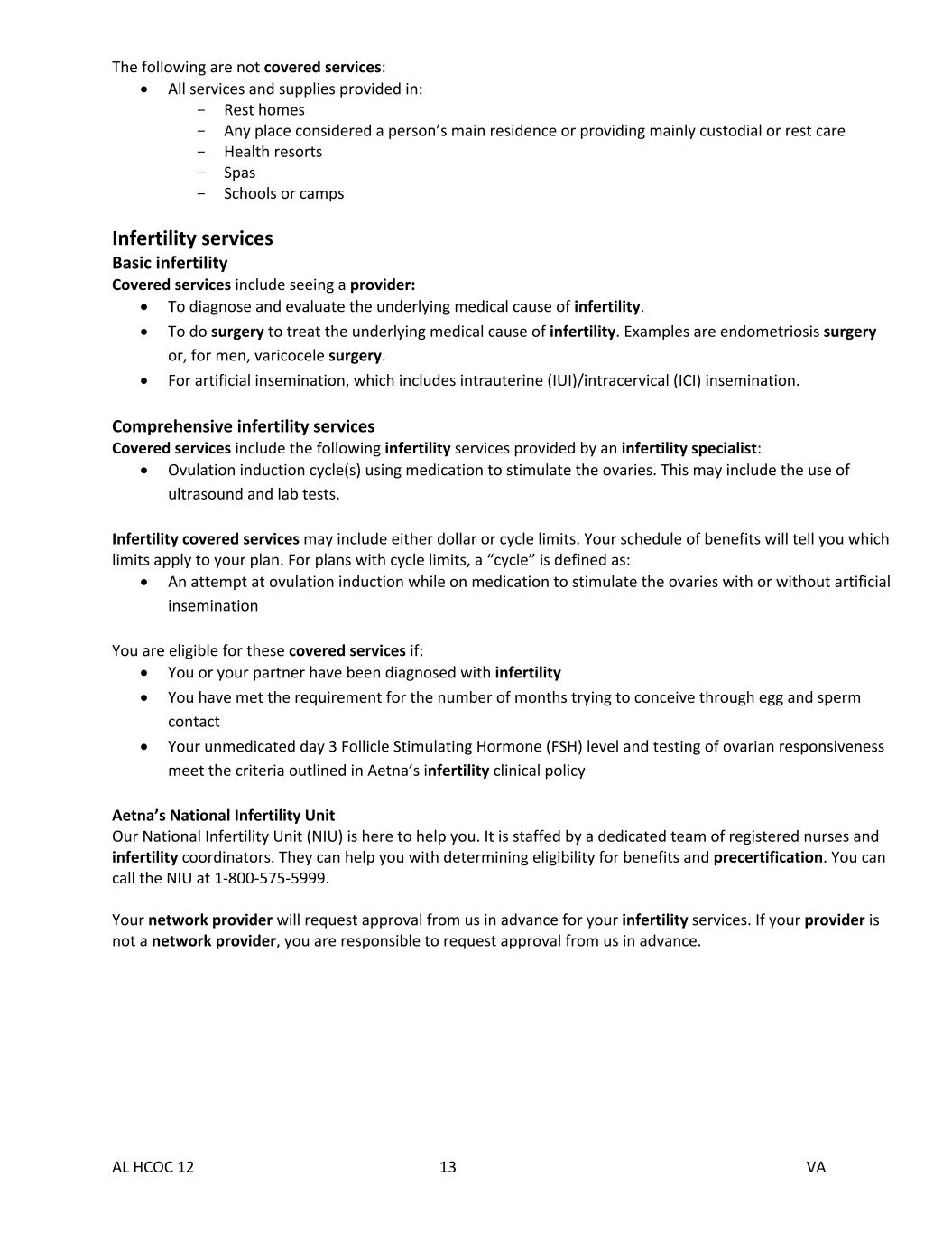 AL HCOC 12 13 VA The following are not covered services: All services and supplies provided in: - Rest homes - Any place considered a person’s main residence or providing mainly custodial or rest care - Health resorts - Spas - Schools or camps Infertility services Basic infertility Covered services include seeing a provider: To diagnose and evaluate the underlying medical cause of infertility. To do surgery to treat the underlying medical cause of infertility. Examples are endometriosis surgery or, for men, varicocele surgery. For artificial insemination, which includes intrauterine (IUI)/intracervical (ICI) insemination. Comprehensive infertility services Covered services include the following infertility services provided by an infertility specialist: Ovulation induction cycle(s) using medication to stimulate the ovaries. This may include the use of ultrasound and lab tests. Infertility covered services may include either dollar or cycle limits. Your schedule of benefits will tell you which limits apply to your plan. For plans with cycle limits, a “cycle” is defined as: An attempt at ovulation induction while on medication to stimulate the ovaries with or without artificial insemination You are eligible for these covered services if: You or your partner have been diagnosed with infertility You have met the requirement for the number of months trying to conceive through egg and sperm contact Your unmedicated day 3 Follicle Stimulating Hormone (FSH) level and testing of ovarian responsiveness meet the criteria outlined in Aetna’s infertility clinical policy Aetna’s National Infertility Unit Our National Infertility Unit (NIU) is here to help you. It is staffed by a dedicated team of registered nurses and infertility coordinators. They can help you with determining eligibility for benefits and precertification. You can call the NIU at 1-800-575-5999. Your network provider will request approval from us in advance for your infertility services. If your provider is not a network provider, you are responsible to request approval from us in advance.