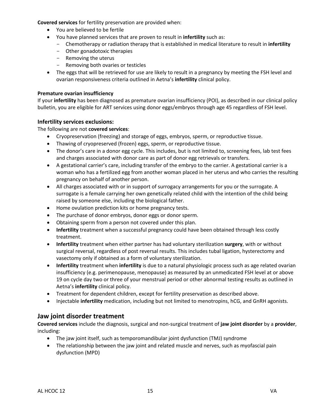 AL HCOC 12 15 VA Covered services for fertility preservation are provided when: You are believed to be fertile You have planned services that are proven to result in infertility such as: - Chemotherapy or radiation therapy that is established in medical literature to result in infertility - Other gonadotoxic therapies - Removing the uterus - Removing both ovaries or testicles The eggs that will be retrieved for use are likely to result in a pregnancy by meeting the FSH level and ovarian responsiveness criteria outlined in Aetna’s infertility clinical policy. Premature ovarian insufficiency If your infertility has been diagnosed as premature ovarian insufficiency (POI), as described in our clinical policy bulletin, you are eligible for ART services using donor eggs/embryos through age 45 regardless of FSH level. Infertility services exclusions: The following are not covered services: Cryopreservation (freezing) and storage of eggs, embryos, sperm, or reproductive tissue. Thawing of cryopreserved (frozen) eggs, sperm, or reproductive tissue. The donor’s care in a donor egg cycle. This includes, but is not limited to, screening fees, lab test fees and charges associated with donor care as part of donor egg retrievals or transfers. A gestational carrier’s care, including transfer of the embryo to the carrier. A gestational carrier is a woman who has a fertilized egg from another woman placed in her uterus and who carries the resulting pregnancy on behalf of another person. All charges associated with or in support of surrogacy arrangements for you or the surrogate. A surrogate is a female carrying her own genetically related child with the intention of the child being raised by someone else, including the biological father. Home ovulation prediction kits or home pregnancy tests. The purchase of donor embryos, donor eggs or donor sperm. Obtaining sperm from a person not covered under this plan. Infertility treatment when a successful pregnancy could have been obtained through less costly treatment. Infertility treatment when either partner has had voluntary sterilization surgery, with or without surgical reversal, regardless of post reversal results. This includes tubal ligation, hysterectomy and vasectomy only if obtained as a form of voluntary sterilization. Infertility treatment when infertility is due to a natural physiologic process such as age related ovarian insufficiency (e.g. perimenopause, menopause) as measured by an unmedicated FSH level at or above 19 on cycle day two or three of your menstrual period or other abnormal testing results as outlined in Aetna’s infertility clinical policy. Treatment for dependent children, except for fertility preservation as described above. Injectable infertility medication, including but not limited to menotropins, hCG, and GnRH agonists. Jaw joint disorder treatment Covered services include the diagnosis, surgical and non-surgical treatment of jaw joint disorder by a provider, including: The jaw joint itself, such as temporomandibular joint dysfunction (TMJ) syndrome The relationship between the jaw joint and related muscle and nerves, such as myofascial pain dysfunction (MPD)