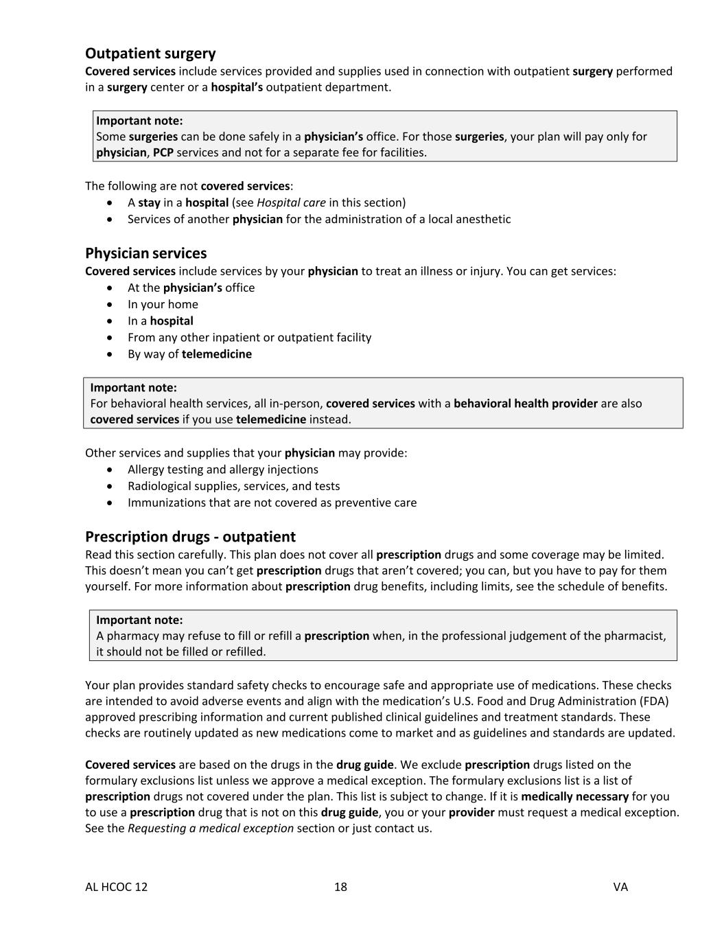 AL HCOC 12 18 VA Outpatient surgery Covered services include services provided and supplies used in connection with outpatient surgery performed in a surgery center or a hospital’s outpatient department. Important note: Some surgeries can be done safely in a physician’s office. For those surgeries, your plan will pay only for physician, PCP services and not for a separate fee for facilities. The following are not covered services: A stay in a hospital (see Hospital care in this section) Services of another physician for the administration of a local anesthetic Physician services Covered services include services by your physician to treat an illness or injury. You can get services: At the physician’s office In your home In a hospital From any other inpatient or outpatient facility By way of telemedicine Important note: For behavioral health services, all in-person, covered services with a behavioral health provider are also covered services if you use telemedicine instead. Other services and supplies that your physician may provide: Allergy testing and allergy injections Radiological supplies, services, and tests Immunizations that are not covered as preventive care Prescription drugs - outpatient Read this section carefully. This plan does not cover all prescription drugs and some coverage may be limited. This doesn’t mean you can’t get prescription drugs that aren’t covered; you can, but you have to pay for them yourself. For more information about prescription drug benefits, including limits, see the schedule of benefits. Important note: A pharmacy may refuse to fill or refill a prescription when, in the professional judgement of the pharmacist, it should not be filled or refilled. Your plan provides standard safety checks to encourage safe and appropriate use of medications. These checks are intended to avoid adverse events and align with the medication’s U.S. Food and Drug Administration (FDA) approved prescribing information and current published clinical guidelines and treatment standards. These checks are routinely updated as new medications come to market and as guidelines and standards are updated. Covered services are based on the drugs in the drug guide. We exclude prescription drugs listed on the formulary exclusions list unless we approve a medical exception. The formulary exclusions list is a list of prescription drugs not covered under the plan. This list is subject to change. If it is medically necessary for you to use a prescription drug that is not on this drug guide, you or your provider must request a medical exception. See the Requesting a medical exception section or just contact us.