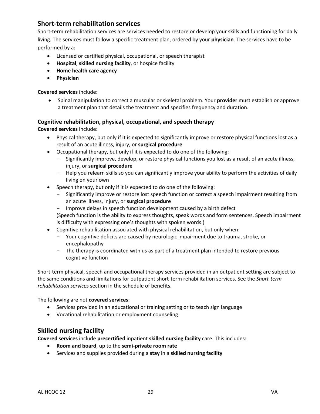 AL HCOC 12 29 VA Short-term rehabilitation services Short-term rehabilitation services are services needed to restore or develop your skills and functioning for daily living. The services must follow a specific treatment plan, ordered by your physician. The services have to be performed by a: Licensed or certified physical, occupational, or speech therapist Hospital, skilled nursing facility, or hospice facility Home health care agency Physician Covered services include: Spinal manipulation to correct a muscular or skeletal problem. Your provider must establish or approve a treatment plan that details the treatment and specifies frequency and duration. Cognitive rehabilitation, physical, occupational, and speech therapy Covered services include: Physical therapy, but only if it is expected to significantly improve or restore physical functions lost as a result of an acute illness, injury, or surgical procedure Occupational therapy, but only if it is expected to do one of the following: - Significantly improve, develop, or restore physical functions you lost as a result of an acute illness, injury, or surgical procedure - Help you relearn skills so you can significantly improve your ability to perform the activities of daily living on your own Speech therapy, but only if it is expected to do one of the following: - Significantly improve or restore lost speech function or correct a speech impairment resulting from an acute illness, injury, or surgical procedure - Improve delays in speech function development caused by a birth defect (Speech function is the ability to express thoughts, speak words and form sentences. Speech impairment is difficulty with expressing one’s thoughts with spoken words.) Cognitive rehabilitation associated with physical rehabilitation, but only when: - Your cognitive deficits are caused by neurologic impairment due to trauma, stroke, or encephalopathy - The therapy is coordinated with us as part of a treatment plan intended to restore previous cognitive function Short-term physical, speech and occupational therapy services provided in an outpatient setting are subject to the same conditions and limitations for outpatient short-term rehabilitation services. See the Short-term rehabilitation services section in the schedule of benefits. The following are not covered services: Services provided in an educational or training setting or to teach sign language Vocational rehabilitation or employment counseling Skilled nursing facility Covered services include precertified inpatient skilled nursing facility care. This includes: Room and board, up to the semi-private room rate Services and supplies provided during a stay in a skilled nursing facility