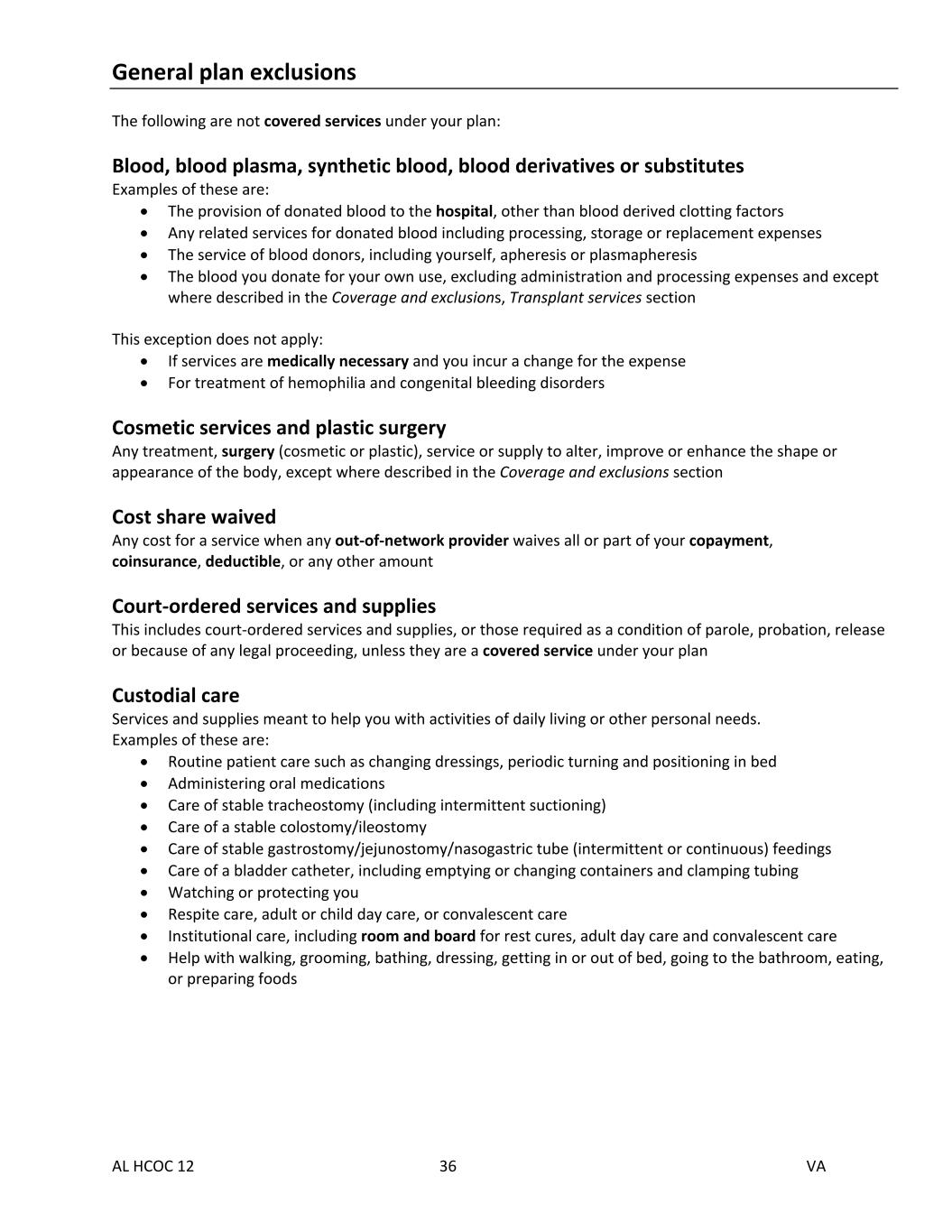 AL HCOC 12 36 VA General plan exclusions The following are not covered services under your plan: Blood, blood plasma, synthetic blood, blood derivatives or substitutes Examples of these are: The provision of donated blood to the hospital, other than blood derived clotting factors Any related services for donated blood including processing, storage or replacement expenses The service of blood donors, including yourself, apheresis or plasmapheresis The blood you donate for your own use, excluding administration and processing expenses and except where described in the Coverage and exclusions, Transplant services section This exception does not apply: If services are medically necessary and you incur a change for the expense For treatment of hemophilia and congenital bleeding disorders Cosmetic services and plastic surgery Any treatment, surgery (cosmetic or plastic), service or supply to alter, improve or enhance the shape or appearance of the body, except where described in the Coverage and exclusions section Cost share waived Any cost for a service when any out-of-network provider waives all or part of your copayment, coinsurance, deductible, or any other amount Court-ordered services and supplies This includes court-ordered services and supplies, or those required as a condition of parole, probation, release or because of any legal proceeding, unless they are a covered service under your plan Custodial care Services and supplies meant to help you with activities of daily living or other personal needs. Examples of these are: Routine patient care such as changing dressings, periodic turning and positioning in bed Administering oral medications Care of stable tracheostomy (including intermittent suctioning) Care of a stable colostomy/ileostomy Care of stable gastrostomy/jejunostomy/nasogastric tube (intermittent or continuous) feedings Care of a bladder catheter, including emptying or changing containers and clamping tubing Watching or protecting you Respite care, adult or child day care, or convalescent care Institutional care, including room and board for rest cures, adult day care and convalescent care Help with walking, grooming, bathing, dressing, getting in or out of bed, going to the bathroom, eating, or preparing foods