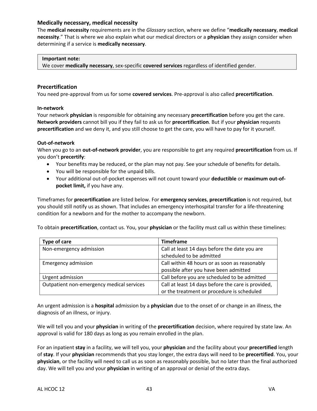 AL HCOC 12 43 VA Medically necessary, medical necessity The medical necessity requirements are in the Glossary section, where we define “medically necessary, medical necessity.” That is where we also explain what our medical directors or a physician they assign consider when determining if a service is medically necessary. Important note: We cover medically necessary, sex-specific covered services regardless of identified gender. Precertification You need pre-approval from us for some covered services. Pre-approval is also called precertification. In-network Your network physician is responsible for obtaining any necessary precertification before you get the care. Network providers cannot bill you if they fail to ask us for precertification. But if your physician requests precertification and we deny it, and you still choose to get the care, you will have to pay for it yourself. Out-of-network When you go to an out-of-network provider, you are responsible to get any required precertification from us. If you don’t precertify: Your benefits may be reduced, or the plan may not pay. See your schedule of benefits for details. You will be responsible for the unpaid bills. Your additional out-of-pocket expenses will not count toward your deductible or maximum out-of- pocket limit, if you have any. Timeframes for precertification are listed below. For emergency services, precertification is not required, but you should still notify us as shown. That includes an emergency interhospital transfer for a life-threatening condition for a newborn and for the mother to accompany the newborn. To obtain precertification, contact us. You, your physician or the facility must call us within these timelines: Type of care Timeframe Non-emergency admission Call at least 14 days before the date you are scheduled to be admitted Emergency admission Call within 48 hours or as soon as reasonably possible after you have been admitted Urgent admission Call before you are scheduled to be admitted Outpatient non-emergency medical services Call at least 14 days before the care is provided, or the treatment or procedure is scheduled An urgent admission is a hospital admission by a physician due to the onset of or change in an illness, the diagnosis of an illness, or injury. We will tell you and your physician in writing of the precertification decision, where required by state law. An approval is valid for 180 days as long as you remain enrolled in the plan. For an inpatient stay in a facility, we will tell you, your physician and the facility about your precertified length of stay. If your physician recommends that you stay longer, the extra days will need to be precertified. You, your physician, or the facility will need to call us as soon as reasonably possible, but no later than the final authorized day. We will tell you and your physician in writing of an approval or denial of the extra days.