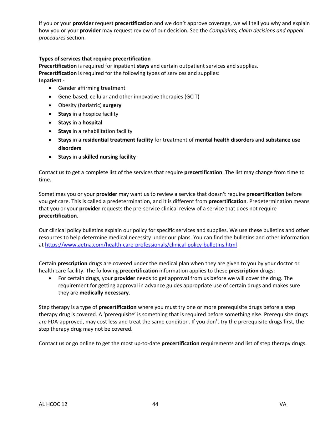 AL HCOC 12 44 VA If you or your provider request precertification and we don’t approve coverage, we will tell you why and explain how you or your provider may request review of our decision. See the Complaints, claim decisions and appeal procedures section. Types of services that require precertification Precertification is required for inpatient stays and certain outpatient services and supplies. Precertification is required for the following types of services and supplies: Inpatient - Gender affirming treatment Gene-based, cellular and other innovative therapies (GCIT) Obesity (bariatric) surgery Stays in a hospice facility Stays in a hospital Stays in a rehabilitation facility Stays in a residential treatment facility for treatment of mental health disorders and substance use disorders Stays in a skilled nursing facility Contact us to get a complete list of the services that require precertification. The list may change from time to time. Sometimes you or your provider may want us to review a service that doesn't require precertification before you get care. This is called a predetermination, and it is different from precertification. Predetermination means that you or your provider requests the pre-service clinical review of a service that does not require precertification. Our clinical policy bulletins explain our policy for specific services and supplies. We use these bulletins and other resources to help determine medical necessity under our plans. You can find the bulletins and other information at https://www.aetna.com/health-care-professionals/clinical-policy-bulletins.html Certain prescription drugs are covered under the medical plan when they are given to you by your doctor or health care facility. The following precertification information applies to these prescription drugs: For certain drugs, your provider needs to get approval from us before we will cover the drug. The requirement for getting approval in advance guides appropriate use of certain drugs and makes sure they are medically necessary. Step therapy is a type of precertification where you must try one or more prerequisite drugs before a step therapy drug is covered. A ‘prerequisite’ is something that is required before something else. Prerequisite drugs are FDA-approved, may cost less and treat the same condition. If you don’t try the prerequisite drugs first, the step therapy drug may not be covered. Contact us or go online to get the most up-to-date precertification requirements and list of step therapy drugs.