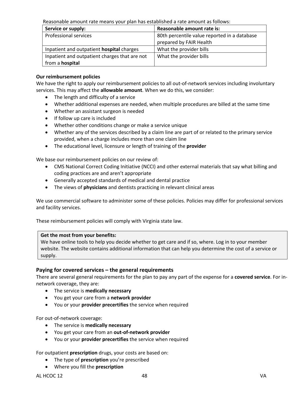 AL HCOC 12 48 VA Reasonable amount rate means your plan has established a rate amount as follows: Service or supply: Reasonable amount rate is: Professional services 80th percentile value reported in a database prepared by FAIR Health Inpatient and outpatient hospital charges What the provider bills Inpatient and outpatient charges that are not from a hospital What the provider bills Our reimbursement policies We have the right to apply our reimbursement policies to all out-of-network services including involuntary services. This may affect the allowable amount. When we do this, we consider: The length and difficulty of a service Whether additional expenses are needed, when multiple procedures are billed at the same time Whether an assistant surgeon is needed If follow up care is included Whether other conditions change or make a service unique Whether any of the services described by a claim line are part of or related to the primary service provided, when a charge includes more than one claim line The educational level, licensure or length of training of the provider We base our reimbursement policies on our review of: CMS National Correct Coding Initiative (NCCI) and other external materials that say what billing and coding practices are and aren’t appropriate Generally accepted standards of medical and dental practice The views of physicians and dentists practicing in relevant clinical areas We use commercial software to administer some of these policies. Policies may differ for professional services and facility services. These reimbursement policies will comply with Virginia state law. Get the most from your benefits: We have online tools to help you decide whether to get care and if so, where. Log in to your member website. The website contains additional information that can help you determine the cost of a service or supply. Paying for covered services – the general requirements There are several general requirements for the plan to pay any part of the expense for a covered service. For in- network coverage, they are: The service is medically necessary You get your care from a network provider You or your provider precertifies the service when required For out-of-network coverage: The service is medically necessary You get your care from an out-of-network provider You or your provider precertifies the service when required For outpatient prescription drugs, your costs are based on: The type of prescription you’re prescribed Where you fill the prescription