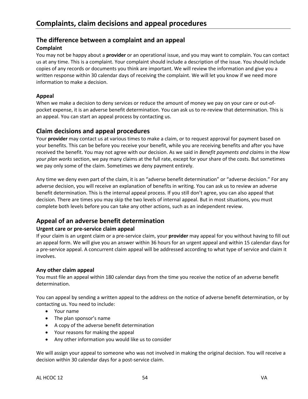 AL HCOC 12 54 VA Complaints, claim decisions and appeal procedures The difference between a complaint and an appeal Complaint You may not be happy about a provider or an operational issue, and you may want to complain. You can contact us at any time. This is a complaint. Your complaint should include a description of the issue. You should include copies of any records or documents you think are important. We will review the information and give you a written response within 30 calendar days of receiving the complaint. We will let you know if we need more information to make a decision. Appeal When we make a decision to deny services or reduce the amount of money we pay on your care or out-of- pocket expense, it is an adverse benefit determination. You can ask us to re-review that determination. This is an appeal. You can start an appeal process by contacting us. Claim decisions and appeal procedures Your provider may contact us at various times to make a claim, or to request approval for payment based on your benefits. This can be before you receive your benefit, while you are receiving benefits and after you have received the benefit. You may not agree with our decision. As we said in Benefit payments and claims in the How your plan works section, we pay many claims at the full rate, except for your share of the costs. But sometimes we pay only some of the claim. Sometimes we deny payment entirely. Any time we deny even part of the claim, it is an “adverse benefit determination” or “adverse decision.” For any adverse decision, you will receive an explanation of benefits in writing. You can ask us to review an adverse benefit determination. This is the internal appeal process. If you still don’t agree, you can also appeal that decision. There are times you may skip the two levels of internal appeal. But in most situations, you must complete both levels before you can take any other actions, such as an independent review. Appeal of an adverse benefit determination Urgent care or pre-service claim appeal If your claim is an urgent claim or a pre-service claim, your provider may appeal for you without having to fill out an appeal form. We will give you an answer within 36 hours for an urgent appeal and within 15 calendar days for a pre-service appeal. A concurrent claim appeal will be addressed according to what type of service and claim it involves. Any other claim appeal You must file an appeal within 180 calendar days from the time you receive the notice of an adverse benefit determination. You can appeal by sending a written appeal to the address on the notice of adverse benefit determination, or by contacting us. You need to include: Your name The plan sponsor’s name A copy of the adverse benefit determination Your reasons for making the appeal Any other information you would like us to consider We will assign your appeal to someone who was not involved in making the original decision. You will receive a decision within 30 calendar days for a post-service claim.