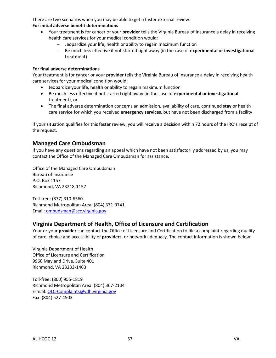 AL HCOC 12 57 VA There are two scenarios when you may be able to get a faster external review: For initial adverse benefit determinations Your treatment is for cancer or your provider tells the Virginia Bureau of Insurance a delay in receiving health care services for your medical condition would: Jeopardize your life, health or ability to regain maximum function Be much less effective if not started right away (in the case of experimental or investigational treatment) For final adverse determinations Your treatment is for cancer or your provider tells the Virginia Bureau of Insurance a delay in receiving health care services for your medical condition would: Jeopardize your life, health or ability to regain maximum function Be much less effective if not started right away (in the case of experimental or investigational treatment), or The final adverse determination concerns an admission, availability of care, continued stay or health care service for which you received emergency services, but have not been discharged from a facility If your situation qualifies for this faster review, you will receive a decision within 72 hours of the IRO’s receipt of the request. Managed Care Ombudsman If you have any questions regarding an appeal which have not been satisfactorily addressed by us, you may contact the Office of the Managed Care Ombudsman for assistance. Office of the Managed Care Ombudsman Bureau of Insurance P.O. Box 1157 Richmond, VA 23218-1157 Toll-free: (877) 310-6560 Richmond Metropolitan Area: (804) 371-9741 Email: ombudsman@scc.virginia.gov Virginia Department of Health, Office of Licensure and Certification Your or your provider can contact the Office of Licensure and Certification to file a complaint regarding quality of care, choice and accessibility of providers, or network adequacy. The contact information is shown below: Virginia Department of Health Office of Licensure and Certification 9960 Mayland Drive, Suite 401 Richmond, VA 23233-1463 Toll-free: (800) 955-1819 Richmond Metropolitan Area: (804) 367-2104 E-mail: OLC-Complaints@vdh.virginia.gov Fax: (804) 527-4503