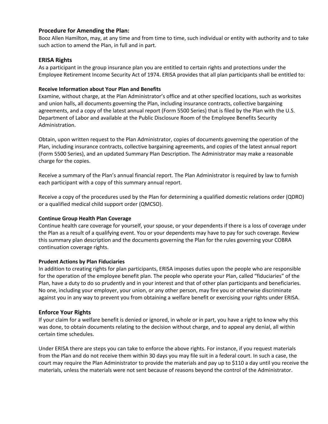 Procedure for Amending the Plan: Booz Allen Hamilton, may, at any time and from time to time, such individual or entity with authority and to take such action to amend the Plan, in full and in part. ERISA Rights As a participant in the group insurance plan you are entitled to certain rights and protections under the Employee Retirement Income Security Act of 1974. ERISA provides that all plan participants shall be entitled to: Receive Information about Your Plan and Benefits Examine, without charge, at the Plan Administrator’s office and at other specified locations, such as worksites and union halls, all documents governing the Plan, including insurance contracts, collective bargaining agreements, and a copy of the latest annual report (Form 5500 Series) that is filed by the Plan with the U.S. Department of Labor and available at the Public Disclosure Room of the Employee Benefits Security Administration. Obtain, upon written request to the Plan Administrator, copies of documents governing the operation of the Plan, including insurance contracts, collective bargaining agreements, and copies of the latest annual report (Form 5500 Series), and an updated Summary Plan Description. The Administrator may make a reasonable charge for the copies. Receive a summary of the Plan’s annual financial report. The Plan Administrator is required by law to furnish each participant with a copy of this summary annual report. Receive a copy of the procedures used by the Plan for determining a qualified domestic relations order (QDRO) or a qualified medical child support order (QMCSO). Continue Group Health Plan Coverage Continue health care coverage for yourself, your spouse, or your dependents if there is a loss of coverage under the Plan as a result of a qualifying event. You or your dependents may have to pay for such coverage. Review this summary plan description and the documents governing the Plan for the rules governing your COBRA continuation coverage rights. Prudent Actions by Plan Fiduciaries In addition to creating rights for plan participants, ERISA imposes duties upon the people who are responsible for the operation of the employee benefit plan. The people who operate your Plan, called “fiduciaries” of the Plan, have a duty to do so prudently and in your interest and that of other plan participants and beneficiaries. No one, including your employer, your union, or any other person, may fire you or otherwise discriminate against you in any way to prevent you from obtaining a welfare benefit or exercising your rights under ERISA. Enforce Your Rights If your claim for a welfare benefit is denied or ignored, in whole or in part, you have a right to know why this was done, to obtain documents relating to the decision without charge, and to appeal any denial, all within certain time schedules. Under ERISA there are steps you can take to enforce the above rights. For instance, if you request materials from the Plan and do not receive them within 30 days you may file suit in a federal court. In such a case, the court may require the Plan Administrator to provide the materials and pay up to $110 a day until you receive the materials, unless the materials were not sent because of reasons beyond the control of the Administrator.
