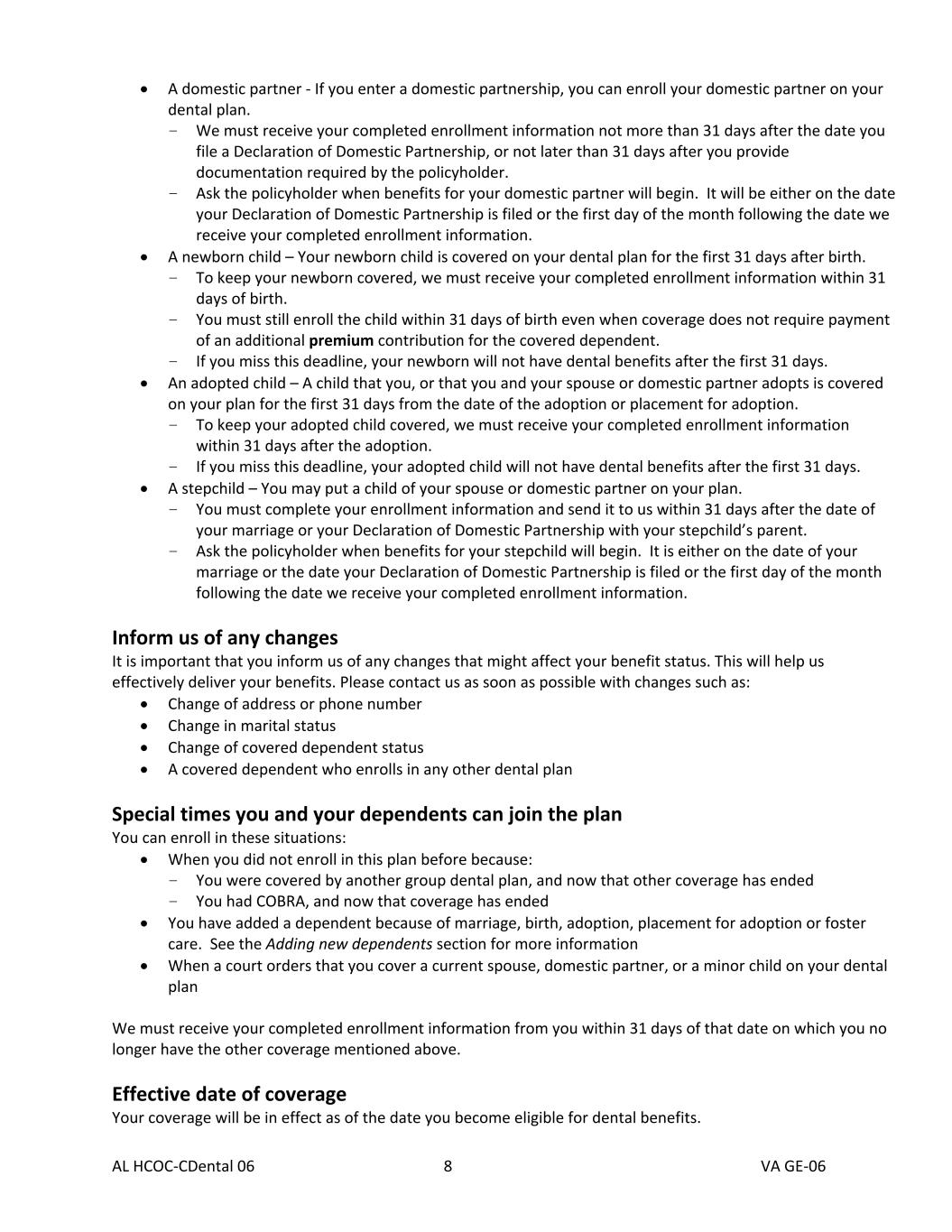 AL HCOC-CDental 06 8 VA GE-06 A domestic partner - If you enter a domestic partnership, you can enroll your domestic partner on your dental plan. – We must receive your completed enrollment information not more than 31 days after the date you file a Declaration of Domestic Partnership, or not later than 31 days after you provide documentation required by the policyholder. – Ask the policyholder when benefits for your domestic partner will begin. It will be either on the date your Declaration of Domestic Partnership is filed or the first day of the month following the date we receive your completed enrollment information. A newborn child – Your newborn child is covered on your dental plan for the first 31 days after birth. – To keep your newborn covered, we must receive your completed enrollment information within 31 days of birth. – You must still enroll the child within 31 days of birth even when coverage does not require payment of an additional premium contribution for the covered dependent. – If you miss this deadline, your newborn will not have dental benefits after the first 31 days. An adopted child – A child that you, or that you and your spouse or domestic partner adopts is covered on your plan for the first 31 days from the date of the adoption or placement for adoption. – To keep your adopted child covered, we must receive your completed enrollment information within 31 days after the adoption. – If you miss this deadline, your adopted child will not have dental benefits after the first 31 days. A stepchild – You may put a child of your spouse or domestic partner on your plan. – You must complete your enrollment information and send it to us within 31 days after the date of your marriage or your Declaration of Domestic Partnership with your stepchild’s parent. – Ask the policyholder when benefits for your stepchild will begin. It is either on the date of your marriage or the date your Declaration of Domestic Partnership is filed or the first day of the month following the date we receive your completed enrollment information. Inform us of any changes It is important that you inform us of any changes that might affect your benefit status. This will help us effectively deliver your benefits. Please contact us as soon as possible with changes such as: Change of address or phone number Change in marital status Change of covered dependent status A covered dependent who enrolls in any other dental plan Special times you and your dependents can join the plan You can enroll in these situations: When you did not enroll in this plan before because: – You were covered by another group dental plan, and now that other coverage has ended – You had COBRA, and now that coverage has ended You have added a dependent because of marriage, birth, adoption, placement for adoption or foster care. See the Adding new dependents section for more information When a court orders that you cover a current spouse, domestic partner, or a minor child on your dental plan We must receive your completed enrollment information from you within 31 days of that date on which you no longer have the other coverage mentioned above. Effective date of coverage Your coverage will be in effect as of the date you become eligible for dental benefits.