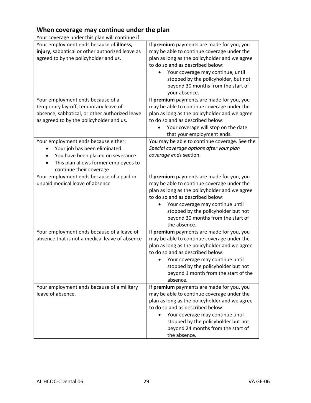 AL HCOC-CDental 06 29 VA GE-06 When coverage may continue under the plan Your coverage under this plan will continue if: Your employment ends because of illness, injury, sabbatical or other authorized leave as agreed to by the policyholder and us. If premium payments are made for you, you may be able to continue coverage under the plan as long as the policyholder and we agree to do so and as described below: Your coverage may continue, until stopped by the policyholder, but not beyond 30 months from the start of your absence. Your employment ends because of a temporary lay-off, temporary leave of absence, sabbatical, or other authorized leave as agreed to by the policyholder and us. If premium payments are made for you, you may be able to continue coverage under the plan as long as the policyholder and we agree to do so and as described below: Your coverage will stop on the date that your employment ends. Your employment ends because either: Your job has been eliminated You have been placed on severance This plan allows former employees to continue their coverage You may be able to continue coverage. See the Special coverage options after your plan coverage ends section. Your employment ends because of a paid or unpaid medical leave of absence If premium payments are made for you, you may be able to continue coverage under the plan as long as the policyholder and we agree to do so and as described below: Your coverage may continue until stopped by the policyholder but not beyond 30 months from the start of the absence. Your employment ends because of a leave of absence that is not a medical leave of absence If premium payments are made for you, you may be able to continue coverage under the plan as long as the policyholder and we agree to do so and as described below: Your coverage may continue until stopped by the policyholder but not beyond 1 month from the start of the absence. Your employment ends because of a military leave of absence. If premium payments are made for you, you may be able to continue coverage under the plan as long as the policyholder and we agree to do so and as described below: Your coverage may continue until stopped by the policyholder but not beyond 24 months from the start of the absence.