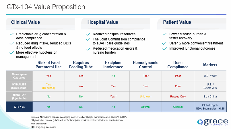 the future prospects of our GTx-104 drug candidate, including but not limited to GTx-104’s potential to be administered to improve the management of hypotension in patients with aneurysmal subarachnoid hemorrhage (“aSAH”); the ability of GTx-104 to achieve a pharmacokinetic (“PK”) and safety profile similar to the oral form of nimodipine; GTx-104’s potential to provide improved bioavailability; GTx-104’s potential to achieve pharmacoeconomic benefit over the oral form of nimodipine; and the timing and ability to receive FDA approval for marketing GTx-104;