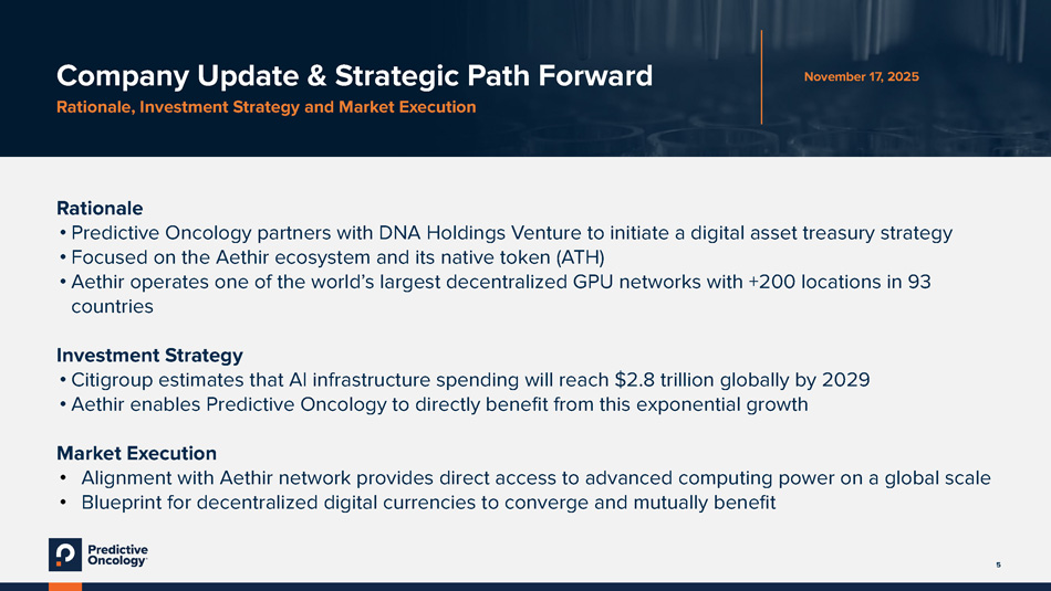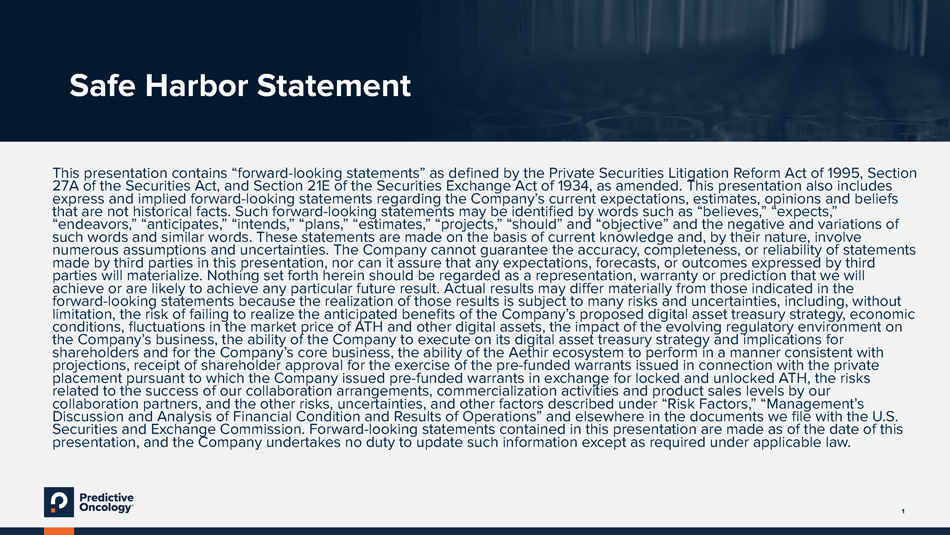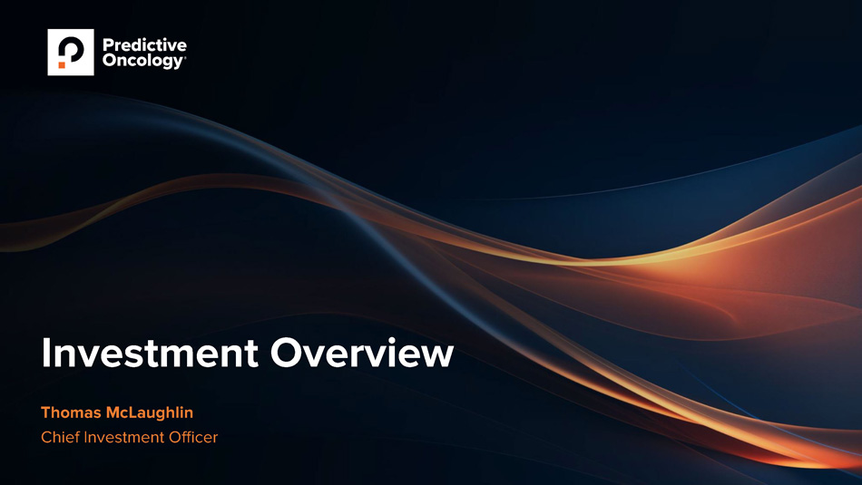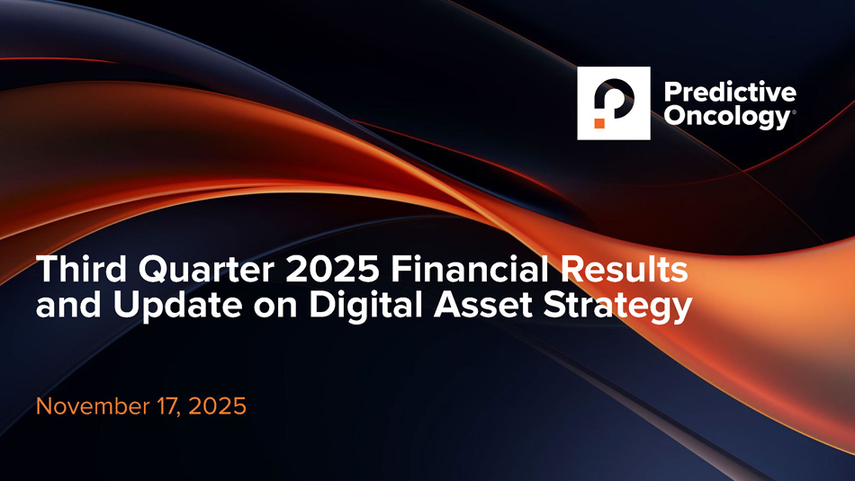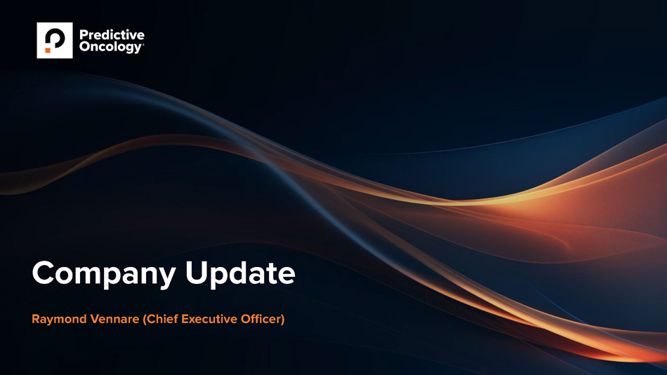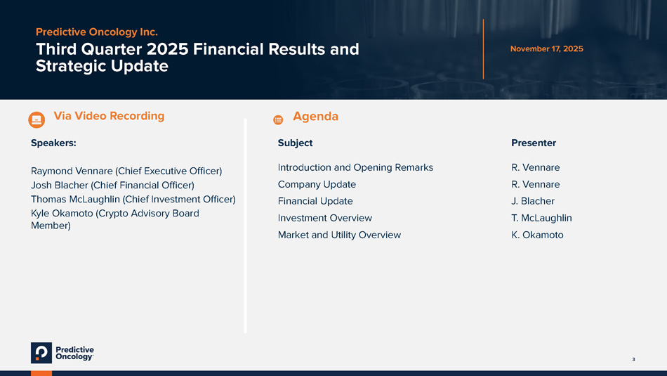 3 Via Video Recording Third Quarter 2025 Financial Results and Strategic Update Predictive Oncology Inc. Speakers: Raymond Vennare (Chief Executive Officer) Josh Blacher (Chief Financial Officer) Thomas McLaughlin (Chief Investment Officer) Kyle Okamoto (Crypto Advisory Board Member) Agenda Subject Presenter Introduction and Opening Remarks Company Update Financial Update Investment Overview Market and Utility Overview R. Vennare R. Vennare J. Blacher T. McLaughlin K. Okamoto November 17, 2025