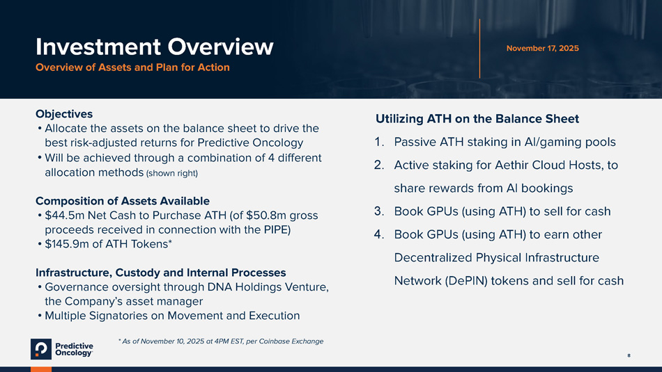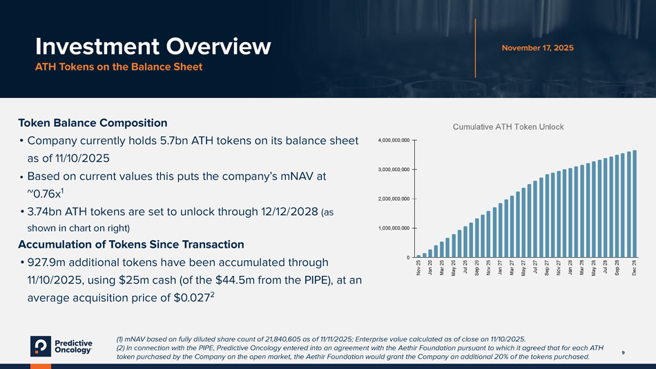 8 Investment Overview Overview of Assets and Plan for Action Objectives • Allocate the assets on the balance sheet to drive the best risk - adjusted returns for Predictive Oncology • Will be achieved through a combination of 4 different allocation methods (shown right) Composition of Assets Available • $44.5m Net Cash to Purchase ATH (of $50.8m gross proceeds received in connection with the PIPE) • $145.9m of ATH Tokens* Infrastructure, Custody and Internal Processes • Governance oversight through DNA Holdings Venture, the Company’s asset manager • Multiple Signatories on Movement and Execution * As of November 10, 2025 at 4PM EST, per Coinbase Exchange November 17, 2025 Utilizing ATH on the Balance Sheet 1. Passive ATH staking in AI/gaming pools 2. Active staking for Aethir Cloud Hosts, to share rewards from AI bookings 3. Book GPUs (using ATH) to sell for cash 4. Book GPUs (using ATH) to earn other Decentralized Physical Infrastructure Network (DePIN) tokens and sell for cash