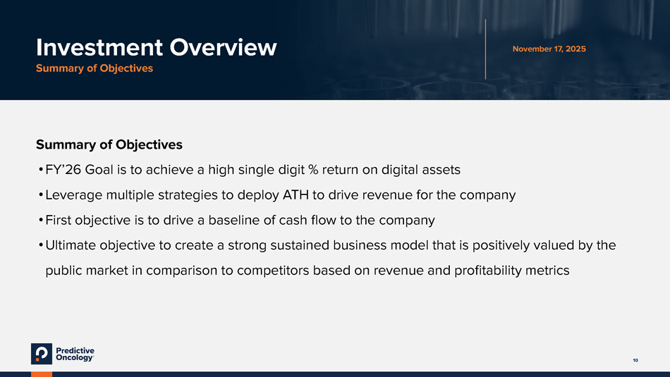 9 Investment Overview ATH Tokens on the Balance Sheet Token Balance Composition • Company currently holds 5.7bn ATH tokens on its balance sheet as of 11/10/2025 • Based on current values this puts the company’s mNAV at ~0.76x 1 • 3.74bn ATH tokens are set to unlock through 12/12/2028 (as shown in chart on right) Accumulation of Tokens Since Transaction • 927.9m additional tokens have been accumulated through 11/10/2025, using $25m cash (of the $44.5m from the PIPE), at an average acquisition price of $0.027 2 November 17, 2025 (1) mNAV based on fully diluted share count of 21,840,605 as of 11/11/2025; Enterprise value calculated as of close on 11/10/2025. (2) In connection with the PIPE, Predictive Oncology entered into an agreement with the Aethir Foundation pursuant to which it agreed that for each ATH token purchased by the Company on the open market, the Aethir Foundation would grant the Company an additional 20% of the tokens purchased.
