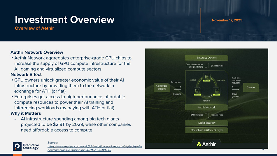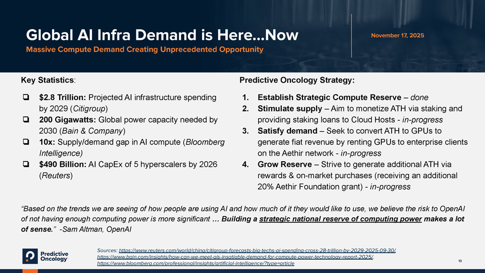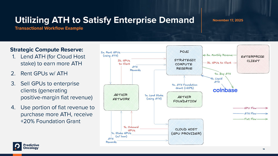 13 Global AI Infra Demand is Here…Now Massive Compute Demand Creating Unprecedented Opportunity Key Statistics : 䙘 $2.8 Trillion: Projected AI infrastructure spending by 2029 ( Citigroup ) 䙘 200 Gigawatts: Global power capacity needed by 2030 ( Bain & Company ) 䙘 10x: Supply/demand gap in AI compute ( Bloomberg Intelligence) 䙘 $490 Billion: AI CapEx of 5 hyperscalers by 2026 ( Reuters ) November 17, 2025 “Based on the trends we are seeing of how people are using AI and how much of it they would like to use, we believe the risk to OpenAI of not having enough computing power is more significant … Building a strategic national reserve of computing power makes a lot of sense . ” - Sam Altman, OpenAI Predictive Oncology Strategy: 1. Establish Strategic Compute Reserve – done 2. Stimulate supply – Aim to monetize ATH via staking and providing staking loans to Cloud Hosts - in - progress 3. Satisfy demand – Seek to convert ATH to GPUs to generate fiat revenue by renting GPUs to enterprise clients on the Aethir network - in - progress 4. Grow Reserve – Strive to generate additional ATH via rewards & on - market purchases (receiving an additional 20% Aethir Foundation grant) - in - progress Sources: https://www.reuters.com/world/china/citigroup - forecasts - big - techs - ai - spending - cross - 28 - trillion - by - 2029 - 2025 - 09 - 30/ , https://www.bain.com/insights/how - can - we - meet - ais - insatiable - demand - for - compute - power - technology - report - 2025/ , https://www.bloomberg.com/professional/insights/artificial - intelligence/?type=article