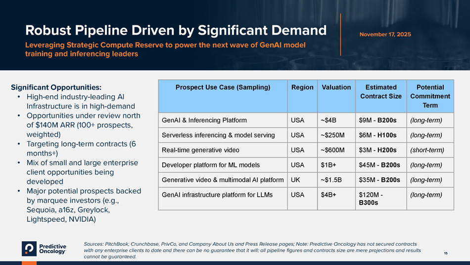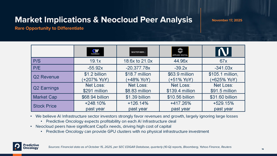 15 Robust Pipeline Driven by Significant Demand Leveraging Strategic Compute Reserve to power the next wave of GenAI model training and inferencing leaders November 17, 2025 Potential Commitment Term Estimated Contract Size Valuation Region Prospect Use Case (Sampling) (long - term) $9M - B200s ~$4B USA GenAI & Inferencing Platform (long - term) $6M - H100s ~$250M USA Serverless inferencing & model serving (short - term) $3M - H200s ~$600M USA Real - time generative video (long - term) $45M - B200s $1B+ USA Developer platform for ML models (long - term) $35M - B200s ~$1.5B UK Generative video & multimodal AI platform (long - term) $120M - B300s $4B+ USA GenAI infrastructure platform for LLMs Significant Opportunities: • High - end industry - leading AI Infrastructure is in high - demand • Opportunities under review north of $140M ARR (100+ prospects, weighted) • Targeting long - term contracts (6 months+) • Mix of small and large enterprise client opportunities being developed • Major potential prospects backed by marquee investors (e.g., Sequoia, a16z, Greylock, Lightspeed, NVIDIA) Sources: PitchBook, Crunchbase, PrivCo, and Company About Us and Press Release pages; Note: Predictive Oncology has not secured contracts with any enterprise clients to date and there can be no guarantee that it will; all pipeline figures and contracts size are mere projections and results cannot be guaranteed.