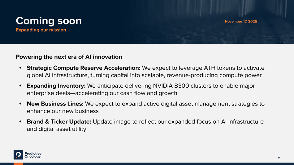 16 Market Implications & Neocloud Peer Analysis Rare Opportunity to Differentiate • We believe AI Infrastructure sector investors strongly favor revenues and growth, largely ignoring large losses • Predictive Oncology expects profitability on each AI Infrastructure deal • Neocloud peers have significant CapEx needs, driving high cost of capital • Predictive Oncology can provide GPU clusters with no physical infrastructure investment 67x 44.96x 18.6x to 21.0x 19.1x P/S - 341.03x - 39.2x - 20,377.78x - 55.92x P/E $105.1 million, (+625% YoY) $63.9 million (+51% YoY) $18.7 million (+48% YoY) $1.2 billion (+207% YoY) Q2 Revenue Net Loss: $91.5 million Net Loss: $139.4 million Net Loss: $8.83 million Net Loss: $291 million Q2 Earnings $31.60 billion $10.56 billion $1.39 billion $68.94 billion Market Cap +529.15% past year +417.26% past year +126.14% past year +248.10% past year Stock Price November 17, 2025 Sources: Financial data as of October 15, 2025, per SEC EDGAR Database, quarterly (10 - Q) reports, Bloomberg, Yahoo Finance, Reuters