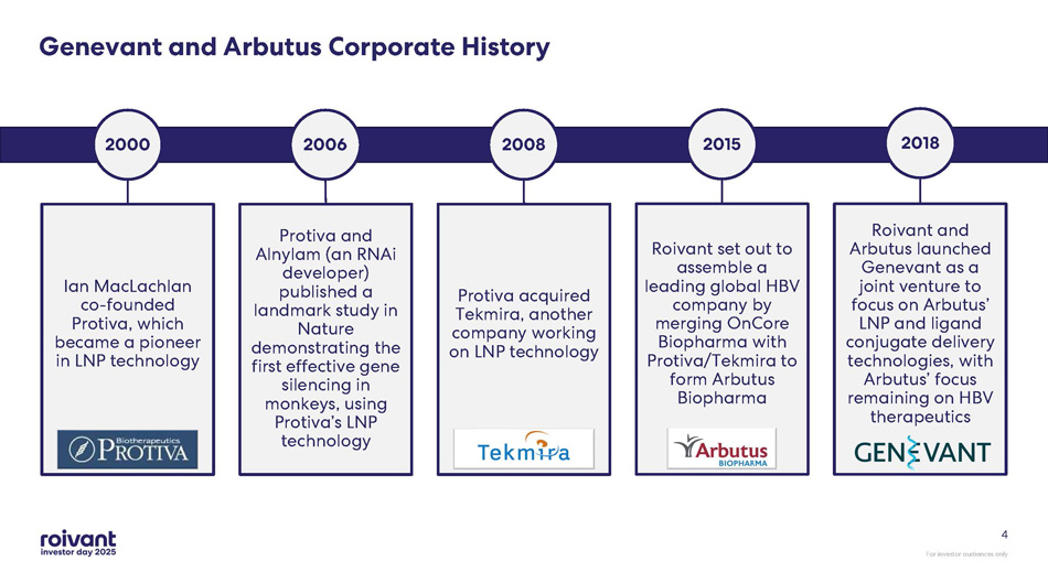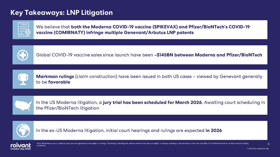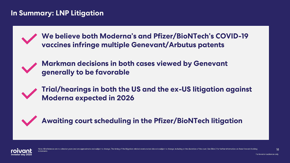 For investor audiences only 3 We believe that both the Moderna COVID - 19 vaccine (SPIKEVAX) and Pfizer/BioNTech’s COVID - 19 vaccine (COMIRNATY) infringe multiple Genevant/Arbutus LNP patents In the ex - US Moderna litigation, initial court hearings and rulings are expected in 2026 Markman rulings (claim construction) have been issued in both US cases – viewed by Genevant generally to be favorable Global COVID - 19 vaccine sales since launch have been ~$14 5 BN between Moderna and Pfizer/BioNTech In the US Moderna litigation, a jury trial has been scheduled for March 2026 . Awaiting court scheduling in the Pfizer/BioNTech litigation Key Takeaways: LNP Litigation For investor audiences only Note: All references are to calendar years and are approximate and subject to change. The timing of the litigation - related event s noted above is subject to change, including at the discretion of the court. See Slide 2 for further information on these fo rwa rd - looking statements