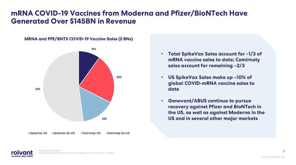 For investor audiences only • Some of the US patents licensed by Genevant from Arbutus include: • Moderna previously sought to invalidate two of the particle composition patents referenced above with IPR challenges but was largely unsuccessful • Litigation is ongoing against Moderna in the US and certain other jurisdictions and against Pfizer/BioNTech in the US to seek appropriate compensation for the unauthorized use of Genevant’s /Arbutus’s patented technology 6 Genevant/Arbutus IP Portfolio and Pending Litigation Expiration Date US Patent No. Subject Matter April 2029 8,058,069 Particle Composition April 2029 8,492,359 April 2029 8,822,668 April 2029 9,364,435 April 2029 11,141,378 July 2023 9,504,651 mRNA - LNP Compositions June 2023 11,298,320 Manufacturing Methods June 2023 11,318,098