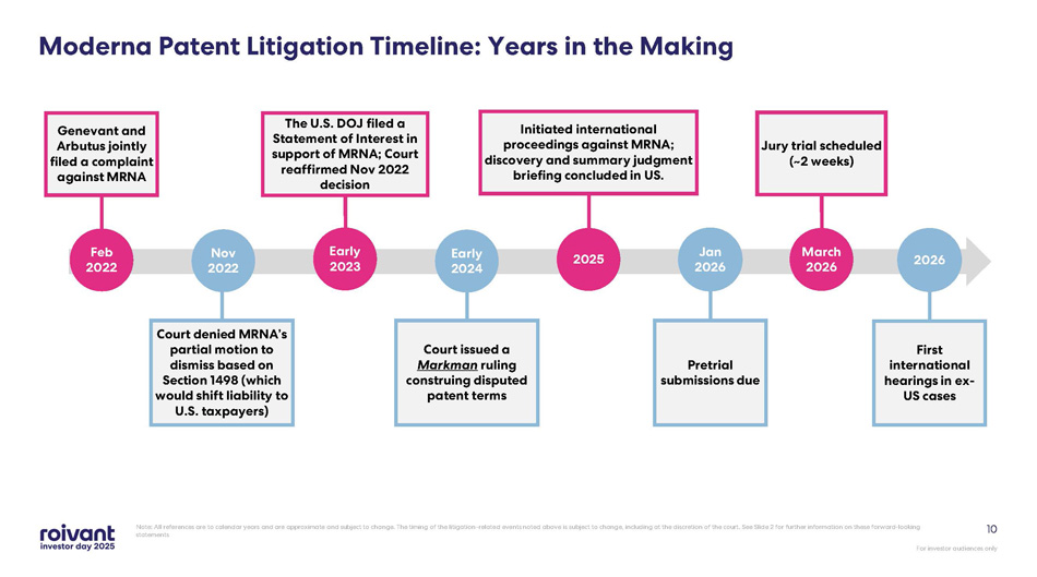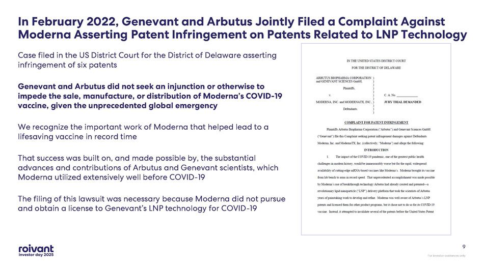 ’s COVID - 19 vaccine (COMIRNATY) infringe multiple Genevant/Arbutus LNP patents In the ex - US Moderna litigation, initial court hearings and rulings are expected in 2026 Markman rulings (claim construction) have been issued in both US cases – viewed by Genevant generally to be favorable Global COVID - 19 vaccine sales since launch have been ~$14 5 BN between Moderna and Pfizer/BioNTech In the US Moderna litigation, a jury trial has been scheduled for March 2026 . Awaiting court scheduling in the Pfizer/BioNTech litigation Key Takeaways: LNP Litigation For investor audiences only