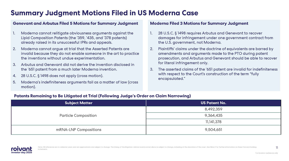 For investor audiences only 10 Moderna Patent Litigation Timeline: Years in the Making Note: All references are to calendar years and are approximate and subject to change. The timing of the litigation - related event s noted above is subject to change, including at the discretion of the court. See Slide 2 for further information on these fo rwa rd - looking statements Early 2023 The U.S. DOJ filed a Statement of Interest in support of MRNA; Court reaffirmed Nov 2022 decision Feb 2022 Genevant and Arbutus jointly filed a complaint against MRNA 2025 Initiated international proceedings against MRNA; discovery and summary judgment briefing concluded in US. Jan 2026 Pretrial submissions due Early 2024 Court issued a Markman ruling construing disputed patent terms Nov 2022 Court denied MRNA’s partial motion to dismiss based on Section 1498 (which would shift liability to U.S. taxpayers) March 2026 Jury trial scheduled (~2 weeks) 2026 First international hearings in ex - US cases