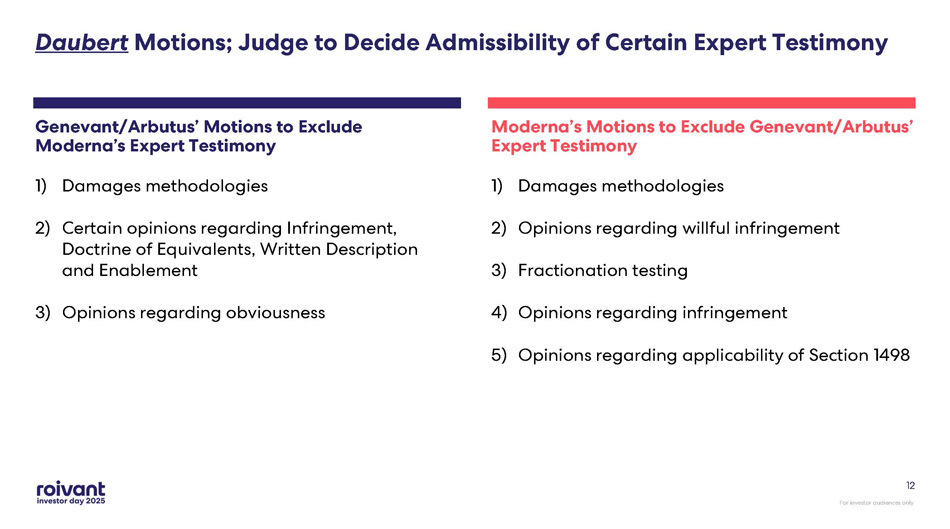For investor audiences only 11 Summary Judgment Motions Filed in US Moderna Case Note: All references are to calendar years and are approximate and subject to change. The timing of the litigation - related event s noted above is subject to change, including at the discretion of the court. See Slide 2 for further information on these fo rwa rd - looking statements Genevant and Arbutus Filed 5 Motions for Summary Judgment 1. Moderna cannot relitigate obviousness arguments against the Lipid Composition Patents (the ’359, ’435, and ’378 patents) already raised in its unsuccessful IPRs and appeals. 2. Moderna cannot argue at trial that the Asserted Patents are invalid because they do not enable someone in the art to practice the inventions without undue experimentation. 3. Arbutus and Genevant did not derive the invention disclosed in the ’651 patent from a much later Moderna invention. 4. 28 U.S.C. § 1498 does not apply (cross motion). 5. Moderna’s indefiniteness arguments fail as a matter of law (cross motion). Moderna Filed 3 Motions for Summary Judgment 1. 28 U.S.C. § 1498 requires Arbutus and Genevant to recover damages for infringement under one government contract from the U.S. government, not Moderna. 2. Plaintiffs’ claims under the doctrine of equivalents are barred by amendments and arguments made to the PTO during patent prosecution, and Arbutus and Genevant should be able to recover for literal infringement only. 3. The asserted claims of the ’651 patent are invalid for indefiniteness with respect to the Court’s construction of the term “fully encapsulated.” Patents Remaining to Be Litigated at Trial (Following Judge’s Order on Claim Narrowing) US Patent No. Subject Matter 8,492,359 Particle Composition 9,364,435 11,141,378 9,504,651 mRNA - LNP Compositions