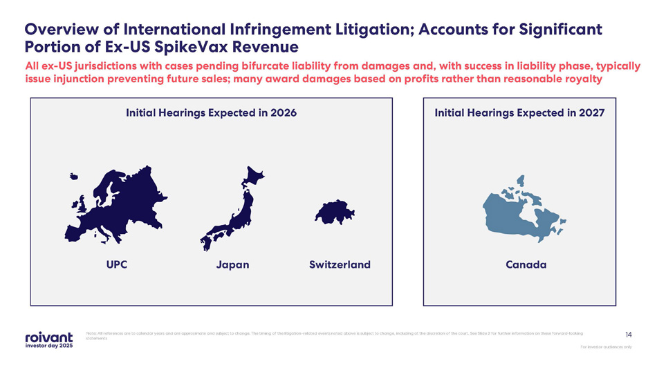 For investor audiences only 14 Overview of International Infringement Litigation; Accounts for Significant Portion of Ex - US SpikeVax Revenue All ex - US jurisdictions with cases pending bifurcate liability from damages and, with success in liability phase, typically issue injunction preventing future sales; many award damages based on profits rather than reasonable royalty Initial Hearings Expected in 2026 Initial Hearings Expected in 2027 UPC Japan Switzerland Canada Note: All references are to calendar years and are approximate and subject to change. The timing of the litigation - related event s noted above is subject to change, including at the discretion of the court. See Slide 2 for further information on these fo rwa rd - looking statements