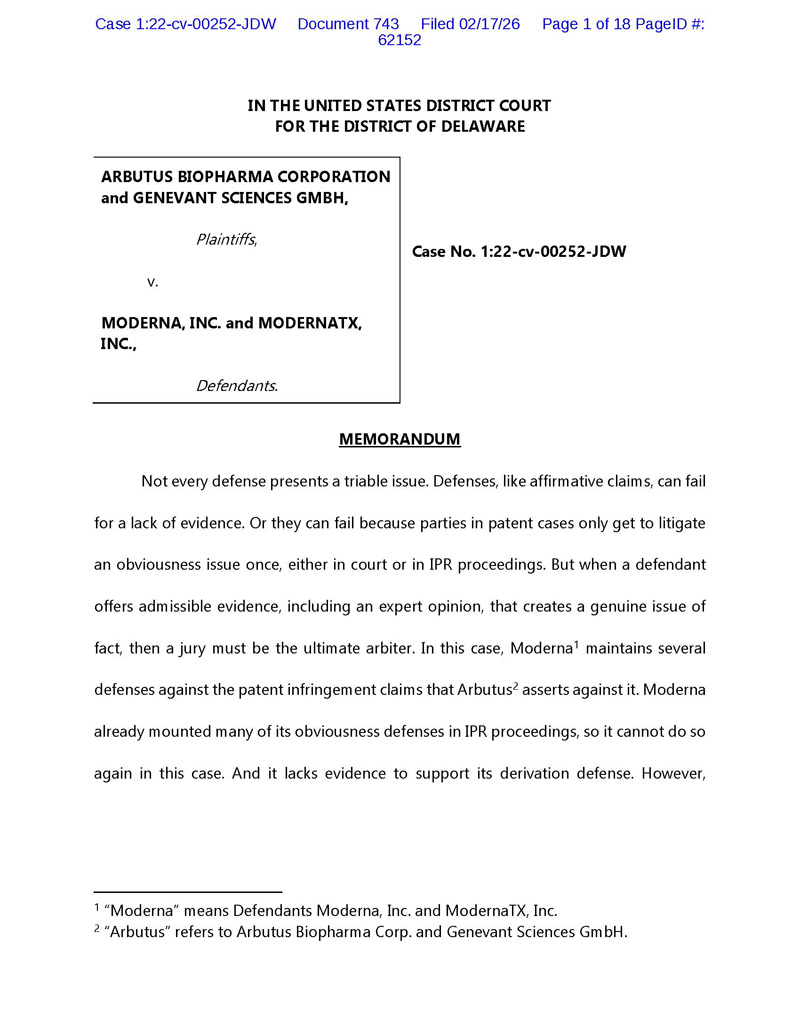 Case No. 1:22 - cv - 00252 - JDW MEMORANDUM Not every defense presents a triable issue . Defenses, like affirmative claims, can fail for a lack of evidence . Or they can fail because parties in patent cases only get to litigate an obviousness issue once, either in court or in IPR proceedings . But when a defendant offers admissible evidence, including an expert opinion, that creates a genuine issue of fact, then a jury must be the ultimate arbiter . In this case, Moderna 1 maintains several defenses against the patent infringement claims that Arbutus 2 asserts against it . Moderna already mounted many of its obviousness defenses in IPR proceedings, so it cannot do so again in this case . And it lacks evidence to support its derivation defense . However, 1 “Moderna” means Defendants Moderna, Inc. and ModernaTX, Inc. 2 “Arbutus” refers to Arbutus Biopharma Corp. and Genevant Sciences GmbH. ARBUTUS BIOPHARMA CORPORATION and GENEVANT SCIENCES GMBH, Plaintiffs , v. MODERNA, INC. and MODERNATX, INC., Defendants . Case 1:22 - cv - 00252 - JDW Document 743 Filed 02/17/26 Page 1 of 18 PageID #: 62152 IN THE UNITED STATES DISTRICT COURT FOR THE DISTRICT OF DELAWARE