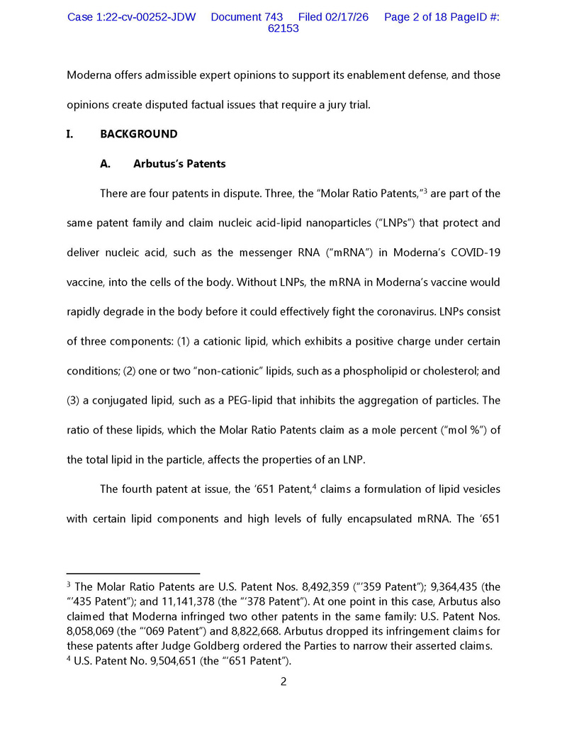 Moderna offers admissible expert opinions to support its enablement defense, and those opinions create disputed factual issues that require a jury trial. I. BACKGROUND A. Arbutus’s Patents There are four patents in dispute . Three, the “Molar Ratio Patents,” 3 are part of the same patent family and claim nucleic acid - lipid nanoparticles (“LNPs”) that protect and deliver nucleic acid, such as the messenger RNA (“mRNA”) in Moderna’s COVID - 19 vaccine, into the cells of the body . Without LNPs, the mRNA in Moderna’s vaccine would rapidly degrade in the body before it could effectively fight the coronavirus . LNPs consist of three components : ( 1 ) a cationic lipid, which exhibits a positive charge under certain conditions ; ( 2 ) one or two “non - cationic” lipids, such as a phospholipid or cholesterol ; and ( 3 ) a conjugated lipid, such as a PEG - lipid that inhibits the aggregation of particles . The ratio of these lipids, which the Molar Ratio Patents claim as a mole percent (“mol % ”) of the total lipid in the particle, affects the properties of an LNP . The fourth patent at issue, the ‘ 651 Patent, 4 claims a formulation of lipid vesicles with certain lipid components and high levels of fully encapsulated mRNA . The ‘ 651 3 The Molar Ratio Patents are U . S . Patent Nos . 8 , 492 , 359 (“’ 359 Patent”) ; 9 , 364 , 435 (the “’ 435 Patent”) ; and 11 , 141 , 378 (the “‘ 378 Patent”) . At one point in this case, Arbutus also claimed that Moderna infringed two other patents in the same family : U . S . Patent Nos . 8 , 058 , 069 (the “‘ 069 Patent”) and 8 , 822 , 668 . Arbutus dropped its infringement claims for these patents after Judge Goldberg ordered the Parties to narrow their asserted claims . 4 U . S . Patent No . 9 , 504 , 651 (the “‘ 651 Patent”) . 2 Case 1:22 - cv - 00252 - JDW Document 743 Filed 02/17/26 Page 2 of 18 PageID #: 62153