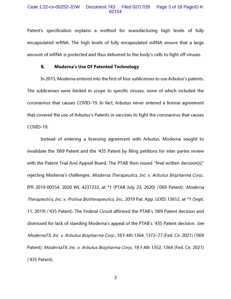 3 Patent’s specification explains a method for manufacturing high levels of fully encapsulated mRNA . The high levels of fully encapsulated mRNA ensure that a large amount of mRNA is protected and thus delivered to the body’s cells to fight off viruses . B. Moderna’s Use Of Patented Technology In 2015 , Moderna entered into the first of four sublicenses to use Arbutus’s patents . The sublicenses were limited in scope to specific viruses, none of which included the coronavirus that causes COVID - 19 . In fact, Arbutus never entered a license agreement that covered the use of Arbutus’s Patents in vaccines to fight the coronavirus that causes COVID - 19 . Instead of entering a licensing agreement with Arbutus, Moderna sought to invalidate the ‘ 069 Patent and the ‘ 435 Patent by filing petitions for inter partes review with the Patent Trial And Appeal Board . The PTAB then issued “final written decision[s]” rejecting Moderna’s challenges . Moderna Therapeutics, Inc . v . Arbutus Biopharma Corp . , IPR 2019 - 00554 , 2020 WL 4237232 , at * 1 (PTAB July 23 , 2020 ) (‘ 069 Patent) ; Moderna Therapeutics, Inc . v . Protiva Biotherapeutics, Inc . , 2019 Pat . App . LEXIS 13612 , at * 1 (Sept . 11 , 2019 ) (‘ 435 Patent) . The Federal Circuit affirmed the PTAB’s ‘ 069 Patent decision and dismissed for lack of standing Moderna’s appeal of the PTAB’s ‘ 435 Patent decision . See ModernaTX, Inc . v . Arbutus Biopharma Corp . , 18 F . 4 th 1364 , 1372 – 77 (Fed . Cir . 2021 ) (‘ 069 Patent) ; ModernaTX, Inc . v . Arbutus Biopharma Corp . , 18 F . 4 th 1352 , 1364 (Fed . Cir . 2021 ) (‘ 435 Patent) . Case 1:22 - cv - 00252 - JDW Document 743 Filed 02/17/26 Page 3 of 18 PageID #: 62154