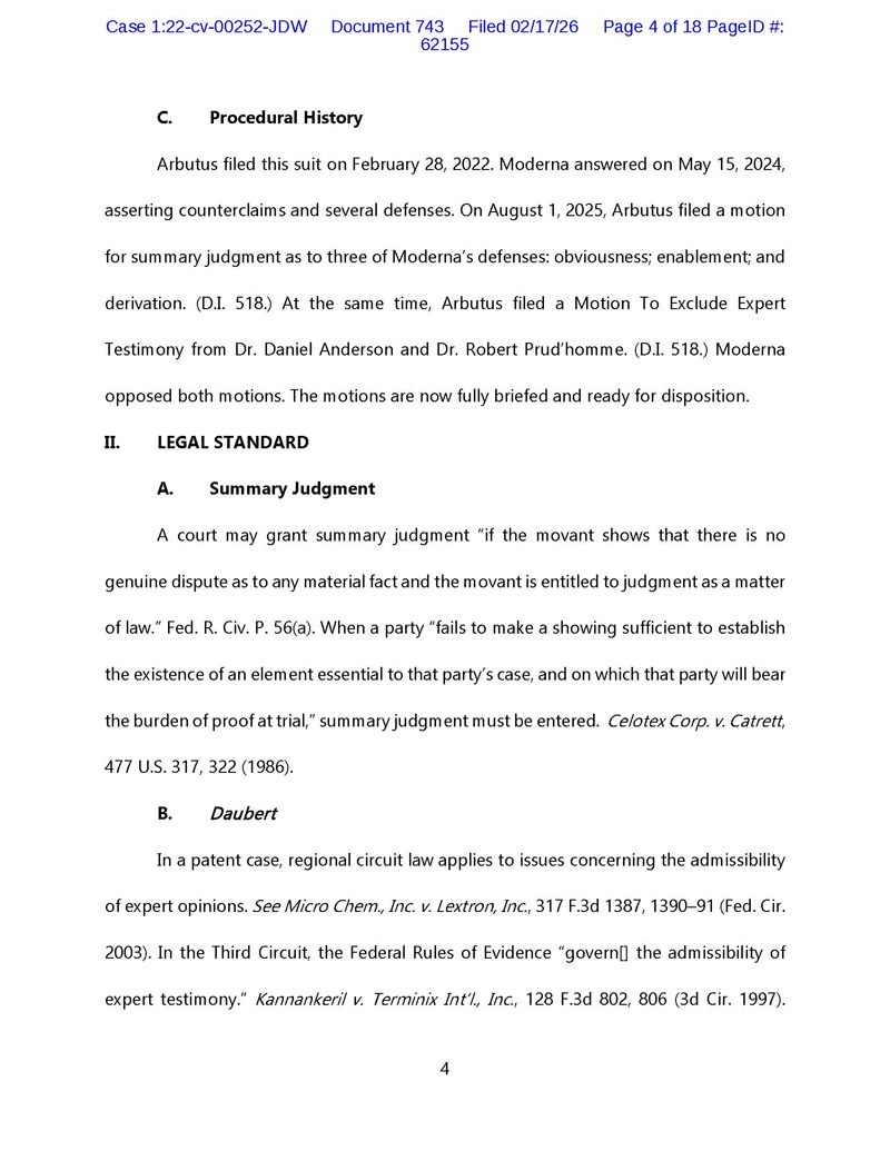 4 C. Procedural History Arbutus filed this suit on February 28 , 2022 . Moderna answered on May 15 , 2024 , asserting counterclaims and several defenses . On August 1 , 2025 , Arbutus filed a motion for summary judgment as to three of Moderna’s defenses : obviousness ; enablement ; and derivation . (D . I . 518 . ) At the same time, Arbutus filed a Motion To Exclude Expert Testimony from Dr . Daniel Anderson and Dr . Robert Prud’homme . (D . I . 518 . ) Moderna opposed both motions . The motions are now fully briefed and ready for disposition . II. LEGAL STANDARD A. Summary Judgment A court may grant summary judgment “if the movant shows that there is no genuine dispute as to any material fact and the movant is entitled to judgment as a matter of law . ” Fed . R . Civ . P . 56 (a) . When a party “fails to make a showing sufficient to establish the existence of an element essential to that party’s case, and on which that party will bear the burden of proof at trial,” summary judgment must be entered . Celotex Corp . v . Catrett , 477 U . S . 317 , 322 ( 1986 ) . B. Daubert In a patent case, regional circuit law applies to issues concerning the admissibility of expert opinions . See Micro Chem . , Inc . v . Lextron, Inc . , 317 F . 3 d 1387 , 1390 – 91 (Fed . Cir . 2003 ) . In the Third Circuit, the Federal Rules of Evidence “govern[] the admissibility of expert testimony . ” Kannankeril v . Terminix Int’l . , Inc . , 128 F . 3 d 802 , 806 ( 3 d Cir . 1997 ) . Case 1:22 - cv - 00252 - JDW Document 743 Filed 02/17/26 Page 4 of 18 PageID #: 62155