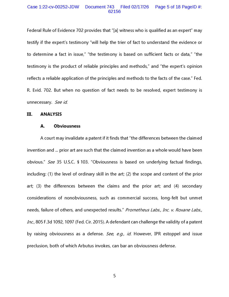 5 Federal Rule of Evidence 702 provides that “[a] witness who is qualified as an expert” may testify if the expert’s testimony “will help the trier of fact to understand the evidence or to determine a fact in issue,” “the testimony is based on sufficient facts or data,” “the testimony is the product of reliable principles and methods,” and “the expert’s opinion reflects a reliable application of the principles and methods to the facts of the case . ” Fed . R . Evid . 702 . But when no question of fact needs to be resolved, expert testimony is unnecessary . See id . III. ANALYSIS A. Obviousness A court may invalidate a patent if it finds that “the differences between the claimed invention and ... prior art are such that the claimed invention as a whole would have b e e n obvious . ” See 35 U . S . C . † 103 . “Obviousness is based on underlying factual findings, including : ( 1 ) the level of ordinary skill i n the art ; ( 2 ) the scope and content of the prior art ; ( 3 ) the differences between the claims and the prior art ; and ( 4 ) secondary considerations of nonobviousness, such as commercial success, long - felt but unmet needs, failure of others, and unexpected results . ” Prometheus Labs . , Inc . v . Roxane Labs . , Inc . , 805 F . 3 d 1092 , 1097 (Fed . Cir . 2015 ) . A defendant c an challenge the validity of a patent by raising obviousness as a defense . See, e . g . , id . However, IPR estoppel and issue preclusion, both of w h i c h Arbutus invokes, can bar an obviousness defense . Case 1:22 - cv - 00252 - JDW Document 743 Filed 02/17/26 Page 5 of 18 PageID #: 62156