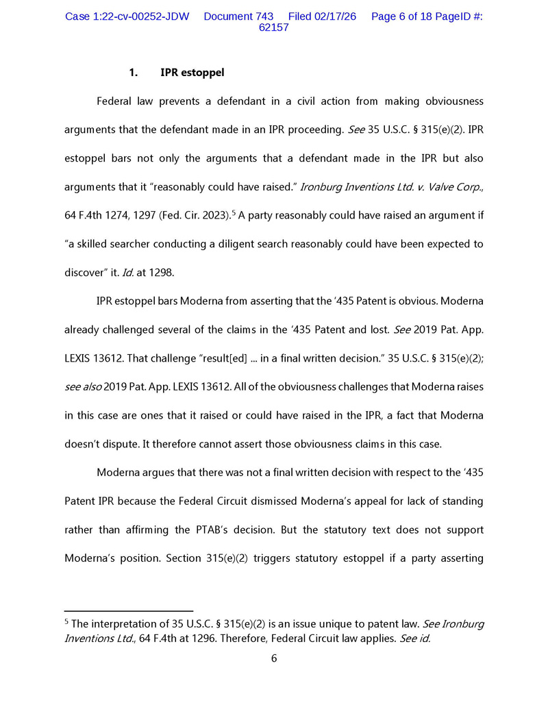1. IPR estoppel Federal law prevents a defendant in a civil action from making obviousness arguments that the defendant made in an IPR proceeding . See 35 U . S . C . † 315 (e)( 2 ) . IPR estoppel bars not only the arguments that a defendant made in the IPR but also arguments that it “reasonably could have raised . ” Ironburg Inventions Ltd . v . Valve Corp . , 64 F . 4 th 1274 , 1297 (Fed . Cir . 2023 ) . 5 A party reasonably could have raised an argument if “a skilled searcher conducting a diligent search reasonably could have been expected to discover” it . Id . at 1298 . IPR estoppel bars Moderna from asserting that the ‘ 435 Patent is obvious . Moderna already challenged several of the claims in the ‘ 435 Patent and lost . See 2019 Pat . App . LEXIS 13612 . That challenge “result[ed] ... in a final written decision . ” 35 U . S . C . † 315 (e)( 2 ) ; see also 2019 Pat . App . LEXIS 13612 . All of the obviousness challenges that Moderna raises in this case are ones that it raised or could have raised in the IPR, a fact that Moderna doesn’t dispute . It therefore cannot assert those obviousness claims in this case . Moderna argues that there was not a final written decision with respect to the ‘ 435 Patent IPR because the Federal Circuit dismissed Moderna’s appeal for lack of standing rather than affirming the PTAB’s decision . But the statutory text does not support Moderna’s position . Section 315 (e)( 2 ) triggers statutory estoppel if a party asserting 5 The interpretation of 35 U.S.C. † 315(e)(2) is an issue unique to patent law. See Ironburg Inventions Ltd. , 64 F.4th at 1296. Therefore, Federal Circuit law applies. See id. 6 Case 1:22 - cv - 00252 - JDW Document 743 Filed 02/17/26 Page 6 of 18 PageID #: 62157