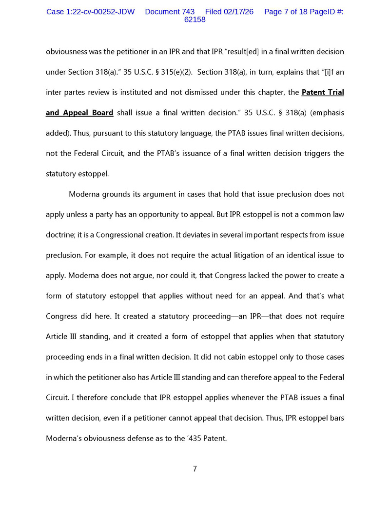 7 obviousness was the petitioner in an IPR and that IPR “result[ed] in a final written decision under Section 318 (a) . ” 35 U . S . C . † 315 (e)( 2 ) . Section 318 (a), in turn, explains that “[i]f an inter partes review is instituted and not dismissed under this chapter, the Patent Trial and Appeal Board shall issue a final written decision . ” 35 U . S . C . † 318 (a) (emphasis added) . Thus, pursuant to this statutory language, the PTAB issues final written decisions, not the Federal Circuit, and the PTAB’s issuance of a final written decision triggers the statutory estoppel . Moderna grounds its argument in cases that hold that issue preclusion does not apply unless a party has an opportunity to appeal . But IPR estoppel is not a common law doctrine ; it is a Congressional creation . It deviates in several important respects from issue preclusion . For example, it does not require the actual litigation of an identical issue to apply . Moderna does not argue, nor could it, that Congress lacked the power to create a form of statutory estoppel that applies without need for an appeal . And that’s what Congress did here . It created a statutory proceeding — an IPR — that does not require Article III standing, and it created a form of estoppel that applies when that statutory proceeding ends in a final written decision . It did not cabin estoppel only to those cases in which the petitioner also has Article III standing and can therefore appeal to the Federal Circuit . I therefore conclude that IPR estoppel applies whenever the PTAB issues a final written decision, even if a petitioner cannot appeal that decision . Thus, IPR estoppel bars Moderna’s obviousness defense as to the ‘ 435 Patent . Case 1:22 - cv - 00252 - JDW Document 743 Filed 02/17/26 Page 7 of 18 PageID #: 62158