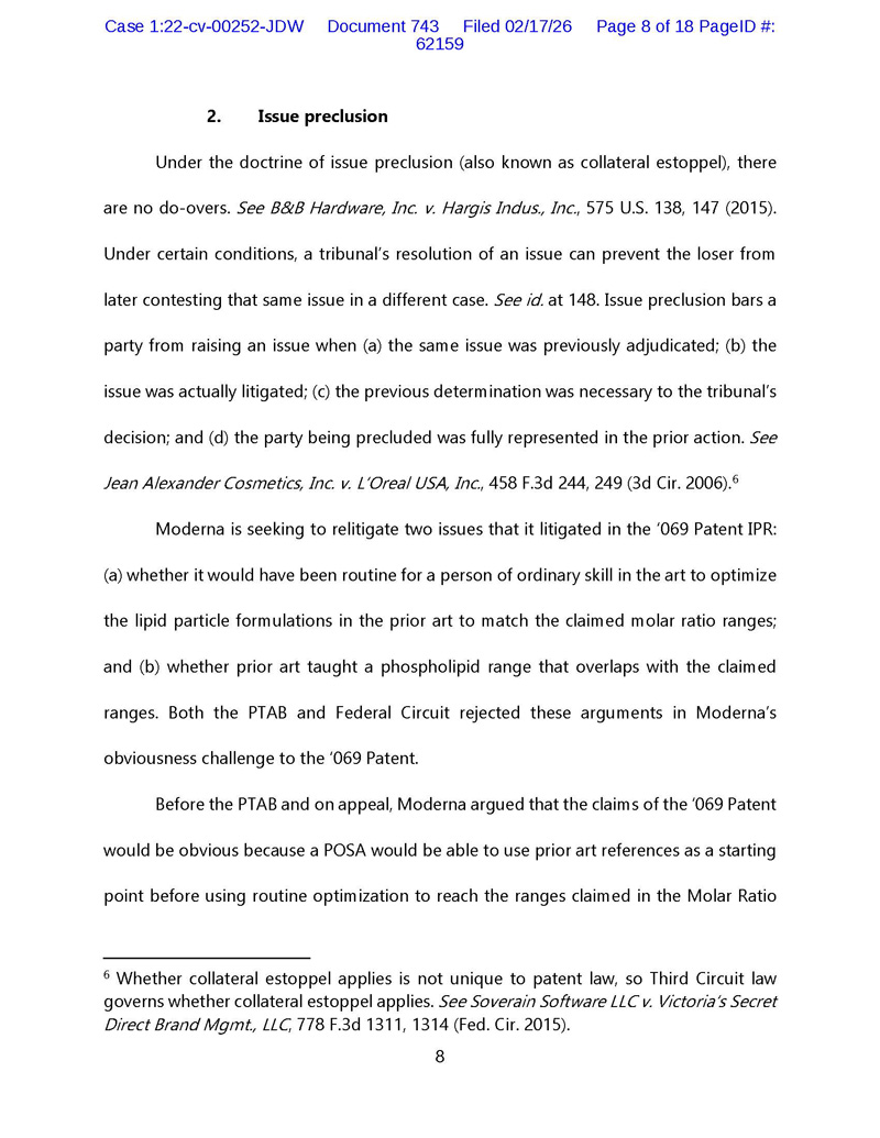 2. Issue preclusion Under the doctrine of issue preclusion (also known as collateral estoppel), there are no do - overs . See B&B Hardware, Inc . v . Hargis Indus . , Inc . , 575 U . S . 138 , 147 ( 2015 ) . Under certain conditions, a tribunal’s resolution of an issue can prevent the loser from later contesting that same issue in a different case . See id . at 148 . Issue preclusion bars a party from raising an issue when (a) the same issue was previously adjudicated ; (b) the issue was actually litigated ; (c) the previous determination was necessary to the tribunal’s decision ; and (d) the party being precluded was fully represented in the prior action . See Jean Alexander Cosmetics, Inc . v . L’Oreal USA, Inc . , 458 F . 3 d 244 , 249 ( 3 d Cir . 2006 ) . 6 Moderna is seeking to relitigate two issues that it litigated in the ‘069 Patent IPR: (a) whether it would have been routine for a person of ordinary skill in the art to optimize the lipid particle formulations in the prior art to match the claimed molar ratio ranges ; and (b) whether prior art taught a phospholipid range that overlaps with the claimed ranges . Both the PTAB and Federal Circuit rejected these arguments in Moderna’s obviousness challenge to the ‘ 069 Patent . Before the PTAB and on appeal, Moderna argued that the claims of the ‘ 069 Patent would be obvious because a POSA would be able to use prior art references as a starting point before using routine optimization to reach the ranges claimed in the Molar Ratio 6 Whether collateral estoppel applies is not unique to patent law, so Third Circuit law governs whether collateral estoppel applies . See Soverain Software LLC v . Victoria’s Secret Direct Brand Mgmt . , LLC , 778 F . 3 d 1311 , 1314 (Fed . Cir . 2015 ) . 8 Case 1:22 - cv - 00252 - JDW Document 743 Filed 02/17/26 Page 8 of 18 PageID #: 62159