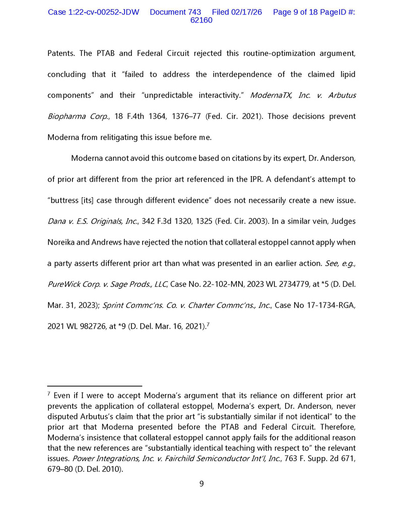 Patents . The PTAB and Federal Circuit rejected this routine - optimization argument, concluding that it “failed to address the interdependence of the claimed lipid components” and their “unpredictable interactivity . ” ModernaTX, Inc . v . Arbutus Biopharma Corp . , 18 F . 4 th 1364 , 1376 – 77 (Fed . Cir . 2021 ) . Those decisions prevent Moderna from relitigating this issue before me . Moderna cannot avoid this outcome based on citations by its expert, Dr . Anderson, of prior art different from the prior art referenced in the IPR . A defendant’s attempt to “buttress [its] case through different evidence” does not necessarily create a new issue . Dana v . E . S . Originals, Inc . , 342 F . 3 d 1320 , 1325 (Fed . Cir . 2003 ) . In a similar vein, Judges Noreika and Andrews have rejected the notion that collateral estoppel cannot apply when a party asserts different prior art than what was presented in an earlier action . See, e . g . , PureWick Corp . v . Sage Prods . , LLC , Case No . 22 - 102 - MN, 2023 WL 2734779 , at * 5 (D . Del . Mar . 31 , 2023 ) ; Sprint Commc’ns . Co . v . Charter Commc’ns . , Inc . , Case No 17 - 1734 - RGA, 2021 WL 982726 , at * 9 (D . Del . Mar . 16 , 2021 ) . 7 7 Even if I were to accept Moderna’s argument that its reliance on different prior art prevents the application of collateral estoppel, Moderna’s expert, Dr . Anderson, never disputed Arbutus’s claim that the prior art “is substantially similar if not identical” to the prior art that Moderna presented before the PTAB and Federal Circuit . Therefore, Moderna’s insistence that collateral estoppel cannot apply fails for the additional reason that the new references are “substantially identical teaching with respect to” the relevant issues . Power Integrations, Inc . v . Fairchild Semiconductor Int’l, Inc . , 763 F . Supp . 2 d 671 , 679 – 80 (D . Del . 2010 ) . 9 Case 1:22 - cv - 00252 - JDW Document 743 Filed 02/17/26 Page 9 of 18 PageID #: 62160