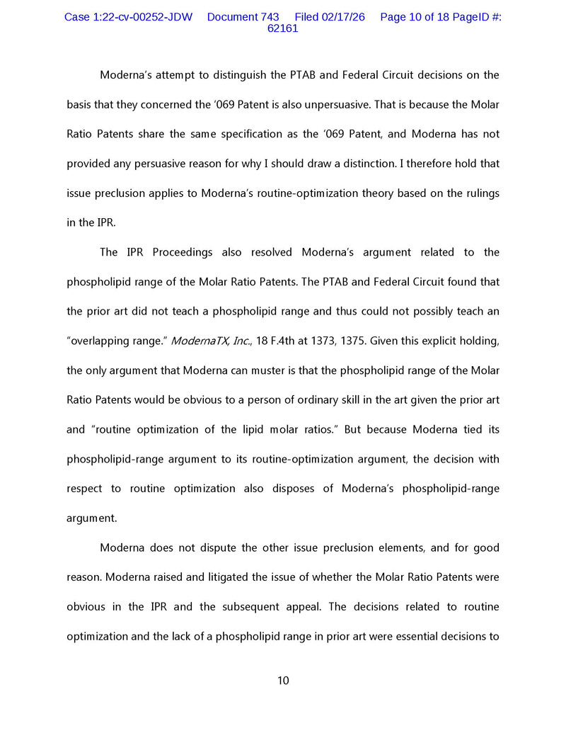 10 Moderna’s attempt to distinguish the PTAB and Federal Circuit decisions on the basis that they concerned the ‘ 069 Patent is also unpersuasive . That is because the Molar Ratio Patents share the same specification as the ‘ 069 Patent, and Moderna has not provided any persuasive reason for why I should draw a distinction . I therefore hold that issue preclusion applies to Moderna’s routine - optimization theory based on the rulings in the IPR . The IPR Proceedings also resolved Moderna’s argument related to the phospholipid range of the Molar Ratio Patents . The PTAB and Federal Circuit found that the prior art did not teach a phospholipid range and thus could not possibly teach an “overlapping range . ” ModernaTX, Inc . , 18 F . 4 th at 1373 , 1375 . Given this explicit holding, the only argument that Moderna can muster is that the phospholipid range of the Molar Ratio Patents would be obvious to a person of ordinary skill in the art given the prior art and “routine optimization of the lipid molar ratios . ” But because Moderna tied its phospholipid - range argument to its routine - optimization argument, the decision with respect to routine optimization also disposes of Moderna’s phospholipid - range argument . Moderna does not dispute the other issue preclusion elements, and for good reason . Moderna raised and litigated the issue of whether the Molar Ratio Patents were obvious in the IPR and the subsequent appeal . The decisions related to routine optimization and the lack of a phospholipid range in prior art were essential decisions to Case 1:22 - cv - 00252 - JDW Document 743 Filed 02/17/26 Page 10 of 18 PageID #: 62161