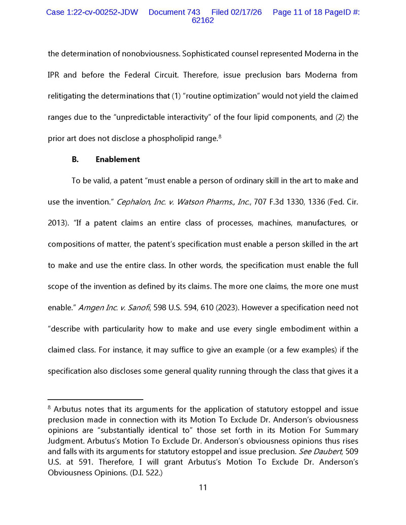 the determination of nonobviousness . Sophisticated counsel represented Moderna in the IPR and before the Federal Circuit . Therefore, issue preclusion bars Moderna from relitigating the determinations that ( 1 ) “routine optimization” would not yield the claimed ranges due to the “unpredictable interactivity” of the four lipid components, and ( 2 ) the prior art does not disclose a phospholipid range . 8 B. Enablement To be valid, a patent “must enable a person of ordinary skill in the art to make and use the invention . ” Cephalon, Inc . v . Watson Pharms . , Inc . , 707 F . 3 d 1330 , 1336 (Fed . Cir . 2013 ) . “If a patent claims an entire class of processes, machines, manufactures, or compositions of matter, the patent’s specification must enable a person skilled in the art to make and use the entire class . In other words, the specification must enable the full scope of the invention as defined by its claims . The more one claims, the more one must enable . ” Amgen Inc . v . Sanofi , 598 U . S . 594 , 610 ( 2023 ) . However a specification need not “describe with particularity how to make and use every single embodiment within a claimed class . For instance, it may suffice to give an example (or a few examples) if the specification also discloses some general quality running through the class that gives it a 8 Arbutus notes that its arguments for the application of statutory estoppel and issue preclusion made in connection with its Motion To Exclude Dr . Anderson’s obviousness opinions are “substantially identical to” those set forth in its Motion For Summary Judgment . Arbutus’s Motion To Exclude Dr . Anderson’s obviousness opinions thus rises and falls with its arguments for statutory estoppel and issue preclusion . See Daubert , 509 U . S . at 591 . Therefore, I will grant Arbutus’s Motion To Exclude Dr . Anderson’s Obviousness Opinions . (D . I . 522 . ) 11 Case 1:22 - cv - 00252 - JDW Document 743 Filed 02/17/26 Page 11 of 18 PageID #: 62162