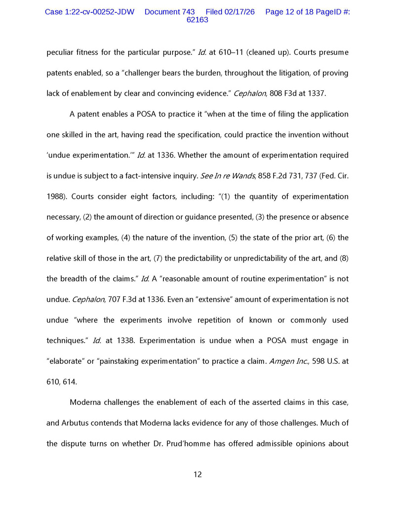 12 Case 1:22 - cv - 00252 - JDW Document 743 Filed 02/17/26 Page 12 of 18 PageID #: 62163 peculiar fitness for the particular purpose . ” Id . at 610 – 11 (cleaned up) . Courts presume patents enabled, so a “challenger bears the burden, throughout the litigation, of proving lack of enablement by clear and convincing evidence . ” Cephalon , 808 F 3 d at 1337 . A patent enables a POSA to practice it “when at the time of filing the application one skilled in the art, having read the specification, could practice the invention without ‘undue experimentation . ’” Id . at 1336 . Whether the amount of experimentation required is undue is subject to a fact - intensive inquiry . See In re Wands , 858 F . 2 d 731 , 737 (Fed . Cir . 1988 ) . Courts consider eight factors, including : “( 1 ) the quantity of experimentation necessary, ( 2 ) the amount of direction or guidance presented, ( 3 ) the presence or absence of working examples, ( 4 ) the nature of the invention, ( 5 ) the state of the prior art, ( 6 ) the relative skill of those in the art, ( 7 ) the predictability or unpredictability of the art, and ( 8 ) the breadth of the claims . ” Id . A “reasonable amount of routine experimentation” is not undue . Cephalon , 707 F . 3 d at 1336 . Even an “extensive” amount of experimentation is not undue “where the experiments involve repetition of known or commonly used techniques . ” Id . at 1338 . Experimentation is undue when a POSA must engage in “elaborate” or “painstaking experimentation” to practice a claim . Amgen Inc . , 598 U . S . at 610 , 614 . Moderna challenges the enablement of each of the asserted claims in this case, and Arbutus contends that Moderna lacks evidence for any of those challenges . Much of the dispute turns on whether Dr . Prud’homme has offered admissible opinions about